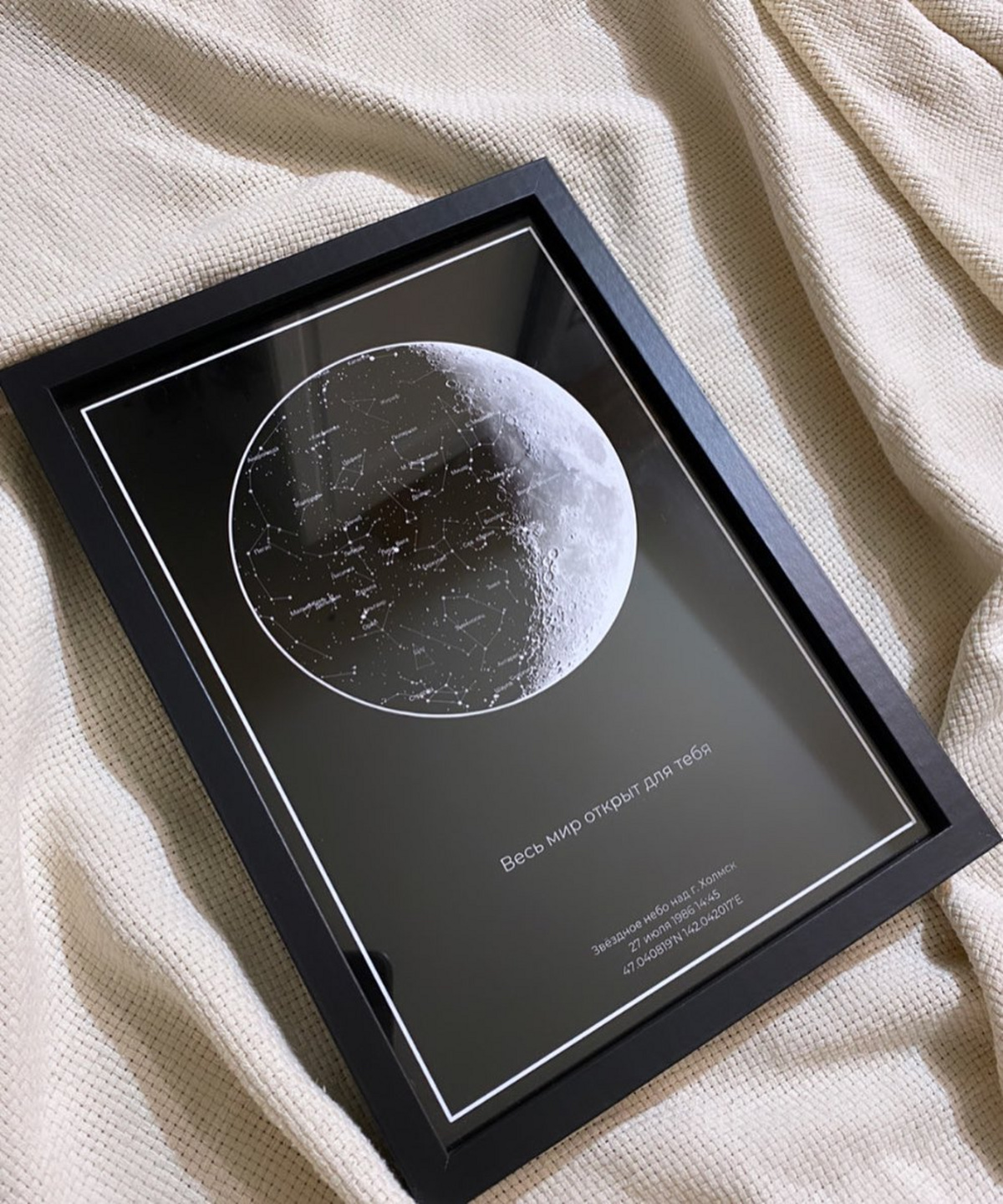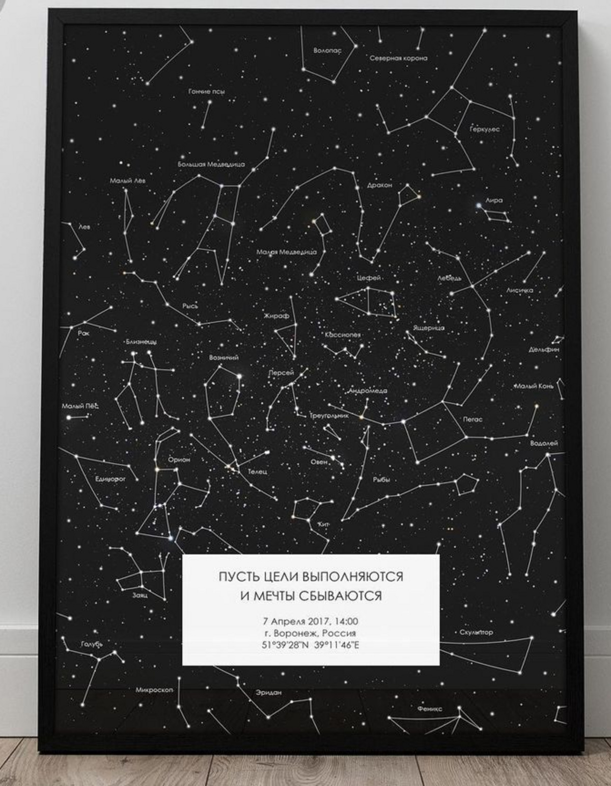 Необычный и памятный подарок для любого человека. В сети довольно много компаний, которые предлагают создать индивидуальную карту звездного неба по времени, дате и месту, а также написать любой текст под ней, что сделает презент более личным и душевным.