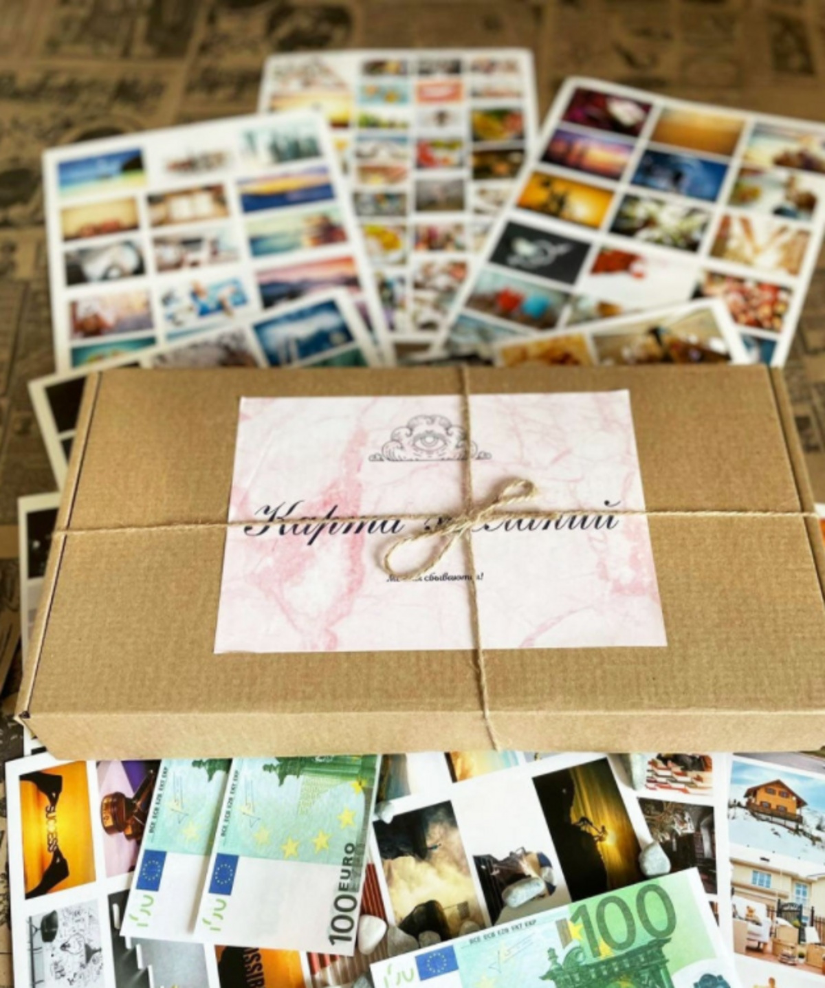 Карта желаний — необычный подарок для мечтателей. Он поможет воплотить в реальность все их заветные желания, а также правильно их сформулировать. Для этого в наборах есть наклейки-аффирмации с пустыми строками для собственных мыслей, лист для написания списка желаний, а также яркие и разнообразные картинки, которые можно собрать в индивидуальную карту мечты.