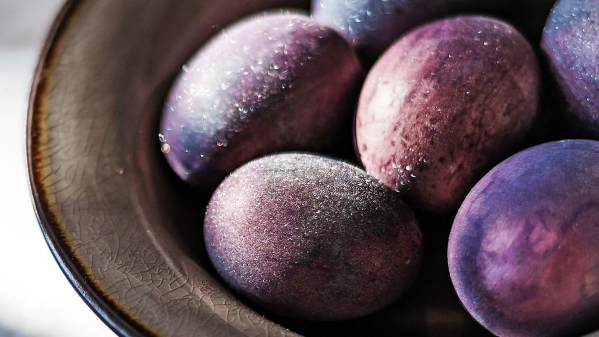 Эстетичный голубой оттенок на яйцах можно получить при окрашивании в отваре краснокочанной капусты, которая дает очень необычный синеватый цвет. Для этого нарежьте кочан на мелкие кусочки, высыпьте в воду и доведите до кипения. В получившийся отвар нужно положить вареные яйца и оставить краситься на три часа. Чтобы достичь разных оттенков, разделите жидкость на несколько частей и добавьте в одну из них ложку соды, а в другую — две ложки уксуса.
