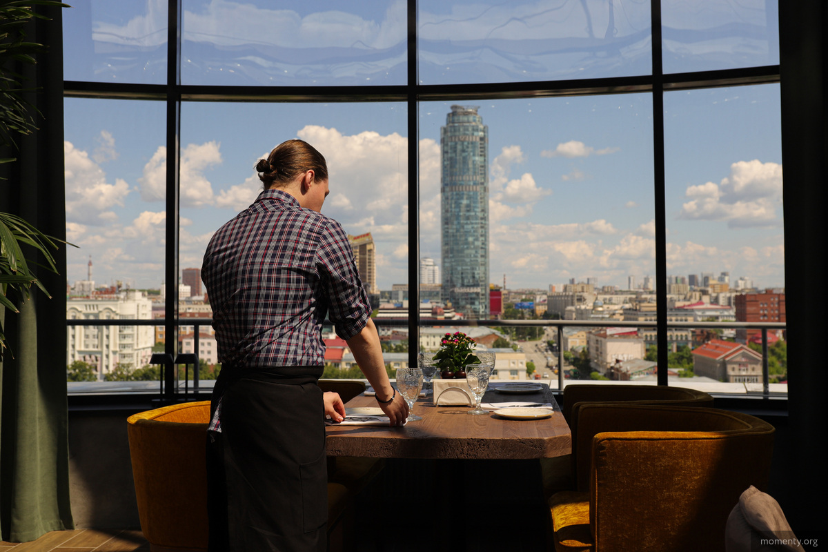 Панорамные окна, приглушенный свет и город за стеклом. Если хочется совместить ужин и салют — это один из подходящих вариантов. Места бронируются заранее.