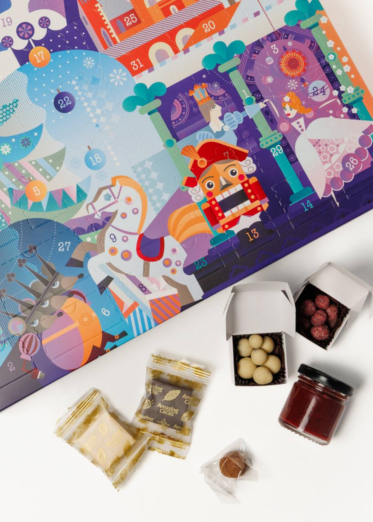 Набор Amazing Cacao «Щелкунчик» оформлен с отсылкой к знаменитому балету. В окошках спрятаны плитки и фигурки из белого, молочного, горького и темного шоколада — маленькие сладкие паузы в ожидании праздника.