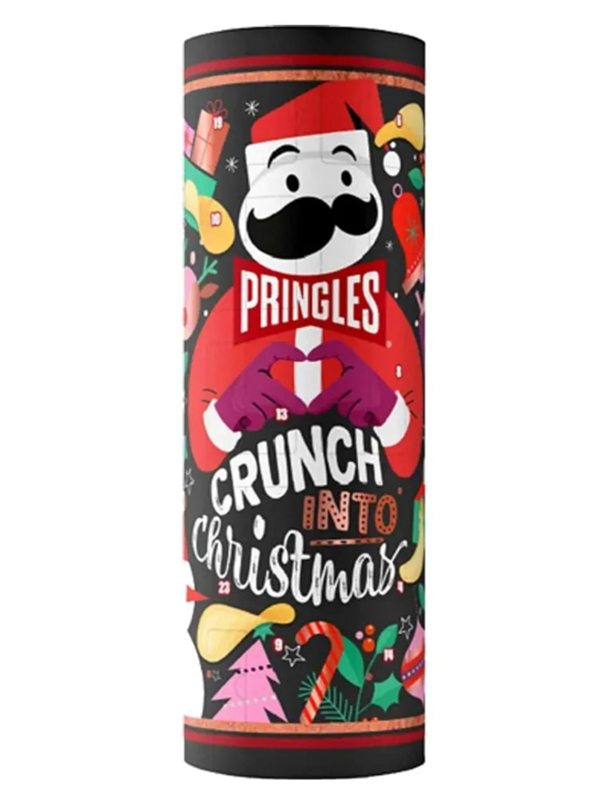 Адвент от Pringles — это 24 мини-банки чипсов: «Сметана и лук», «Острый и пряный», «Барбекю» и «Сладкий перец». Отличный спутник для зимних фильмов и долгих вечеров дома.