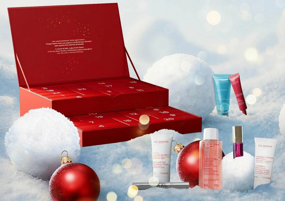 Адвент-календарь Clarins 2025 включает 24 средства по уходу и красоте. Внутри вас ждут мини-сыворотки, увлажняющие кремы, маски, очищающие продукты, косметика для тела, декоративная линейка и пробник парфюма.