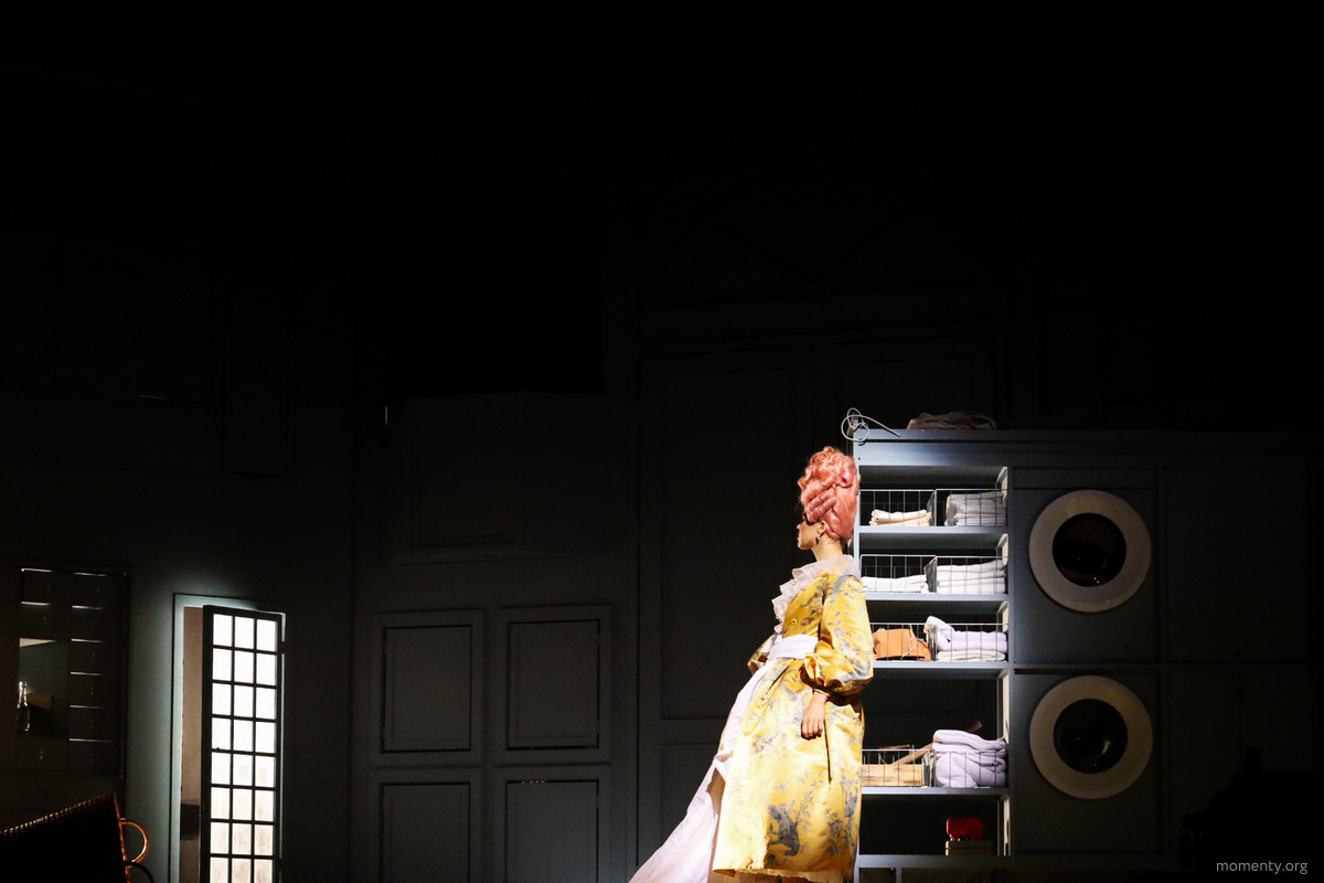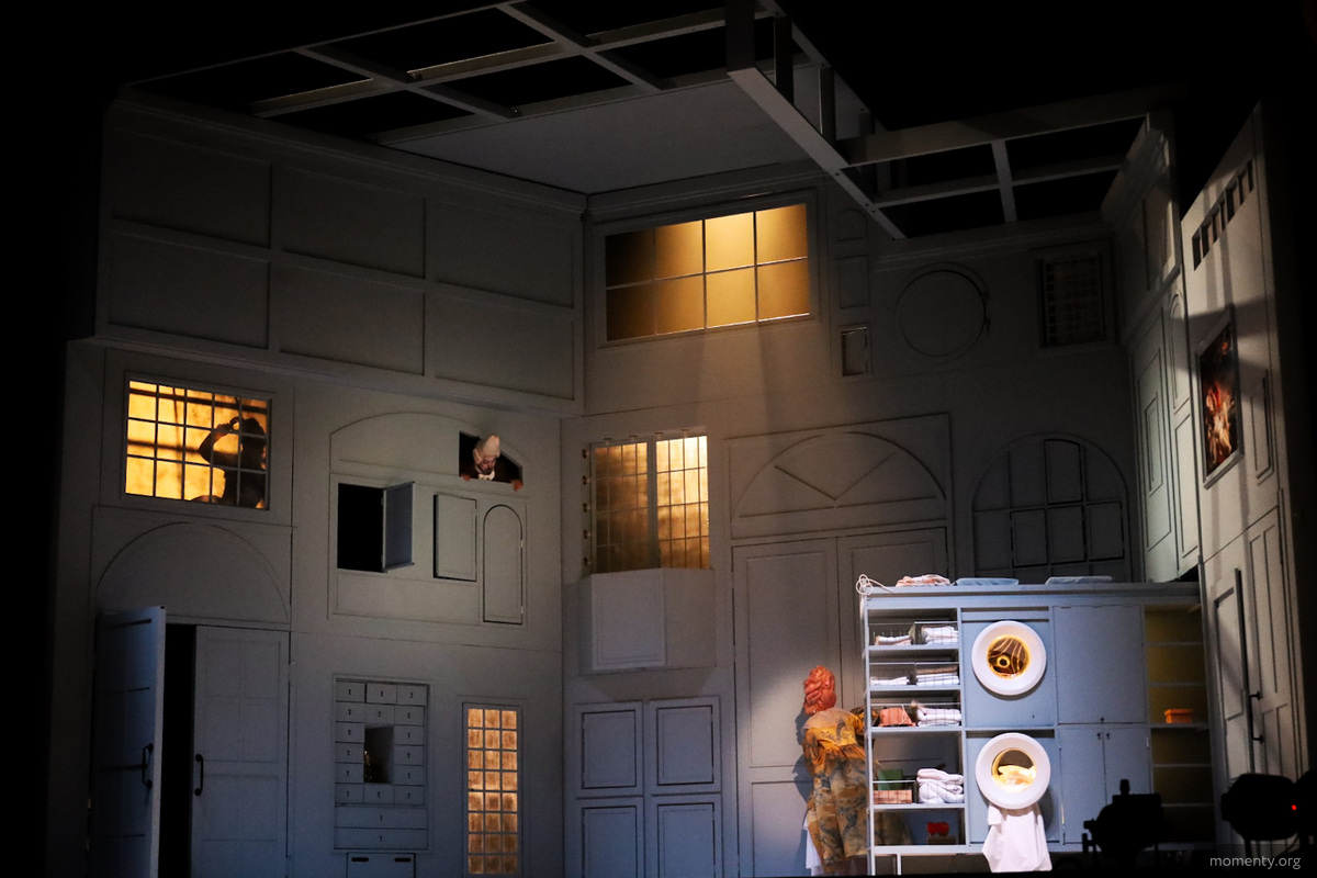 Декорация спроектирована универсальной и работает на протяжении всего действия. За многочисленными дверями скрываются сюрпризы — например, в какой-то момент на сцене появляются стиральные машины. Пространство трансформируется еще и благодаря световым решениям.
