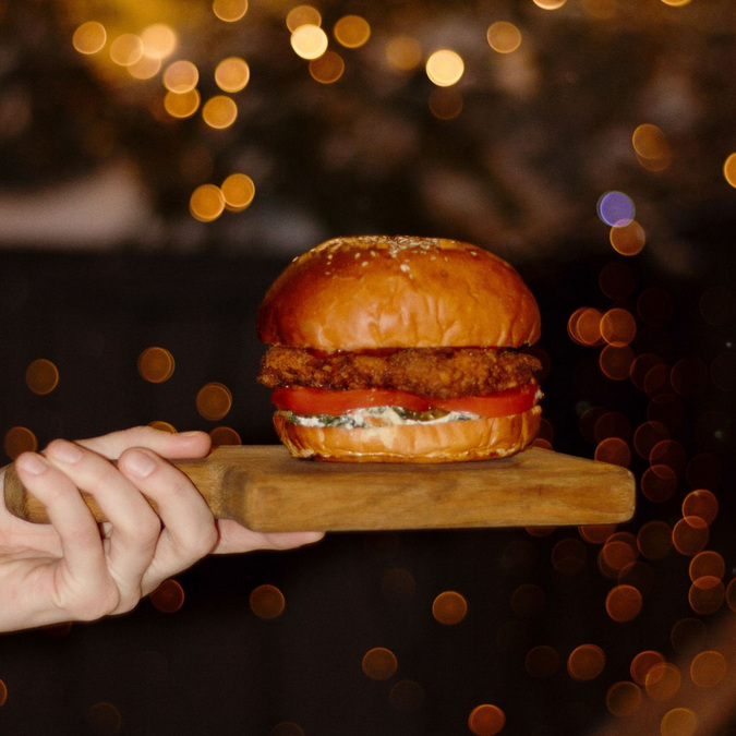 Сэндвич недели — Лана с курицей, на булке для бургера с коул слоу из кейла, трюфельным соусом и маринованным огурцом.