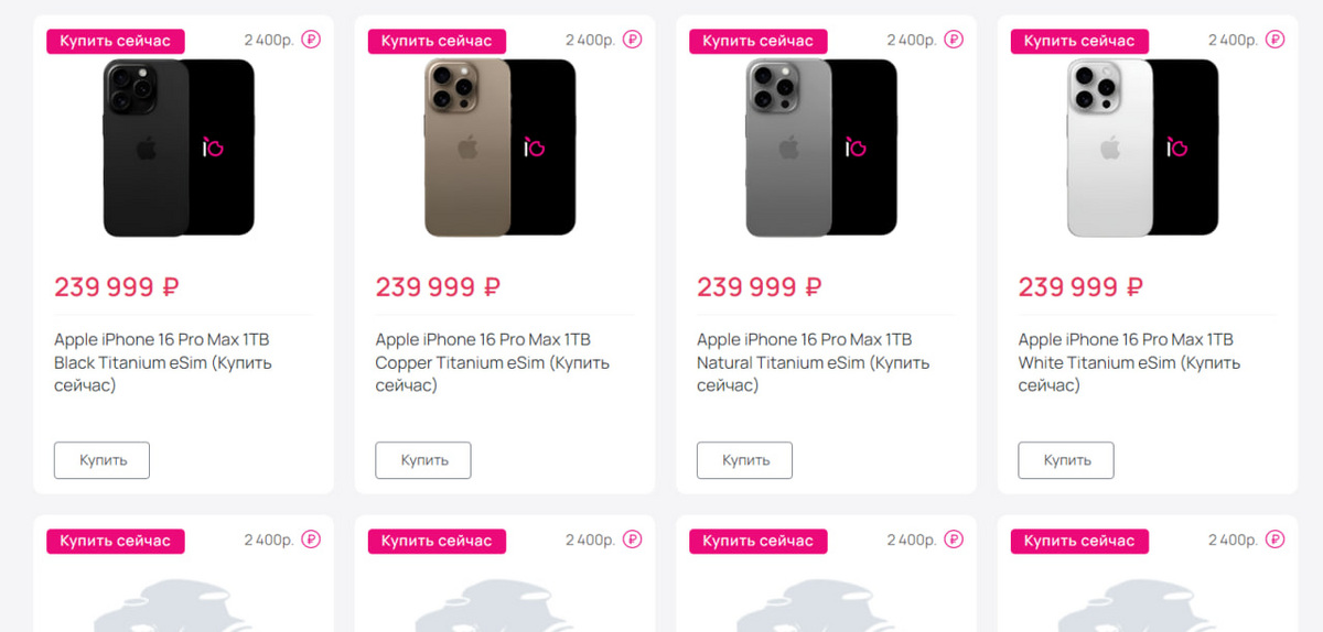 За Pro Max просят от 150 до 240 тысяч рублей — все зависит от объема памяти, который может достигать одного терабайта. В то же время стартовая цена на pro-версию начинается от 115 тысяч рублей. Самый доступный вариант нового iPhone 16 предлагается за 92 тысячи рублей. Эта модель обладает двумя камерами, обновленным дизайном и памятью на 128 гигабайтов.