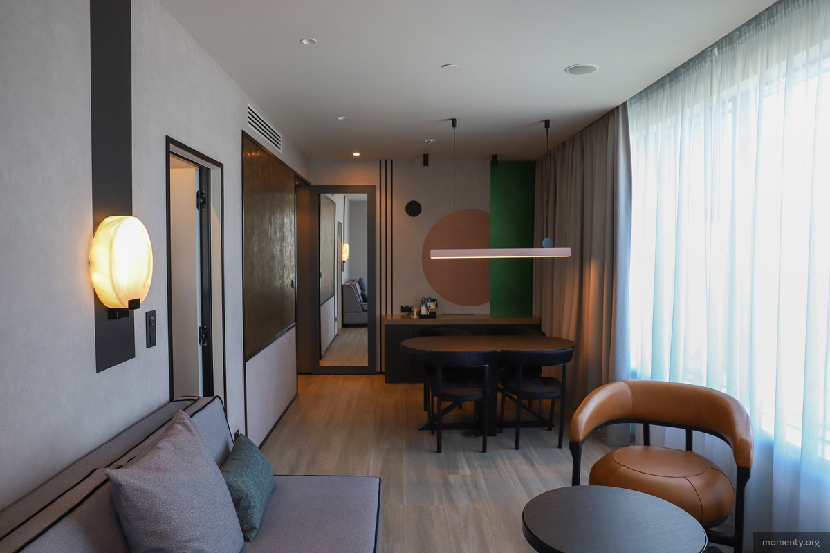 — За счет select service мы установили более демократичные цены. В таком формате гости могут чувствовать себя свободнее: у нас нет определенного дресс-кода, в лобби с круглосуточным маркетом расслабленная атмосфера, фитнес-зал тоже работает 24/7. Чтобы поддерживать такое настроение мы разработали органичное пространство, где стойка регистрации плавно перетекает в маркет и Zoom Bar в стиле городских джунглей, — поделилась в разговоре с «Моментами» менеджер по маркетинговым коммуникациям Hyatt Place Дарья Волкова.