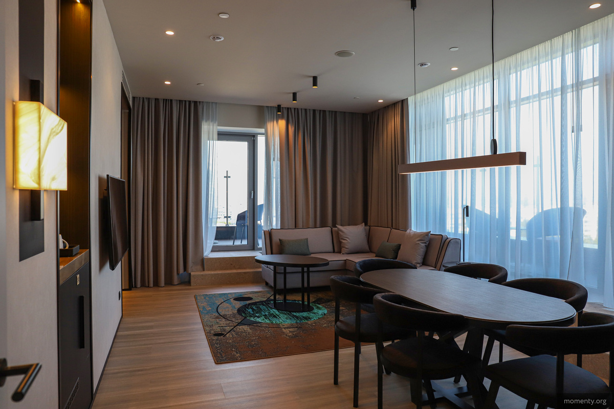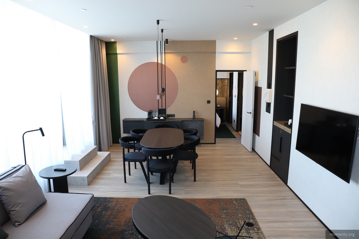 Для номеров отеля выбрали смелый дизайн. В цвете превалируют малахитовый зеленый и спокойные темные оттенки. В номерах люкс на высоких этажах дизайнеры старались сохранять больше света и воздуха — панорамные окна и собственная терраса расширяют пространство. Однако бюджетные номера ощутимо более компактные. Ведущий элемент декора — медные пластины и панели на мебели. Малахитовую историю продолжают ковры, декоративные подушки и драпировка.