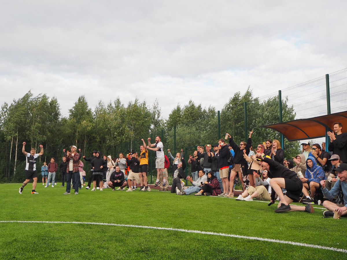 Все ближе итоговый матч, и все напряженнее становится игра на поле. Динамичная музыка и ярая поддержка болельщиков — вот признаки приближающегося финала. Со счетом 4:2 Stenograffia выигрывает у Jawsspot. У «Брусники» и «Мизантропа» ничья. Болельщики постепенно перебираются на поле, где сейчас будет решаться, кто пройдет в финал. Надо слышать эти возгласы поддержки в адрес «Мизантропа». Серия пенальти заканчивается — «Мизантроп» проходит в финал.