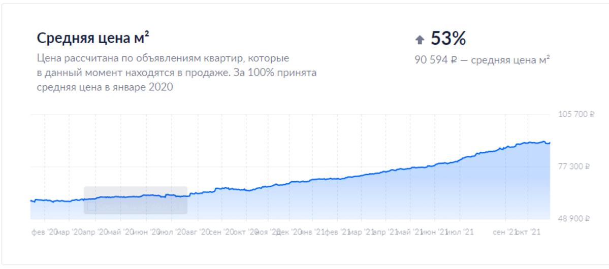 Аналитика сервиса «Циан» отмечает, что за весь период пандемии коронавируса год цены выросли на 53% именно на квартиры в новостройках. В начале 2020 года один квадратный метр стоил около 60 тысяч рублей. К концу этого же года стоимость увеличилась на 10 тысяч рублей. Кроме того, если верить отчету, точно также снизился и спрос на новые квартиры.
