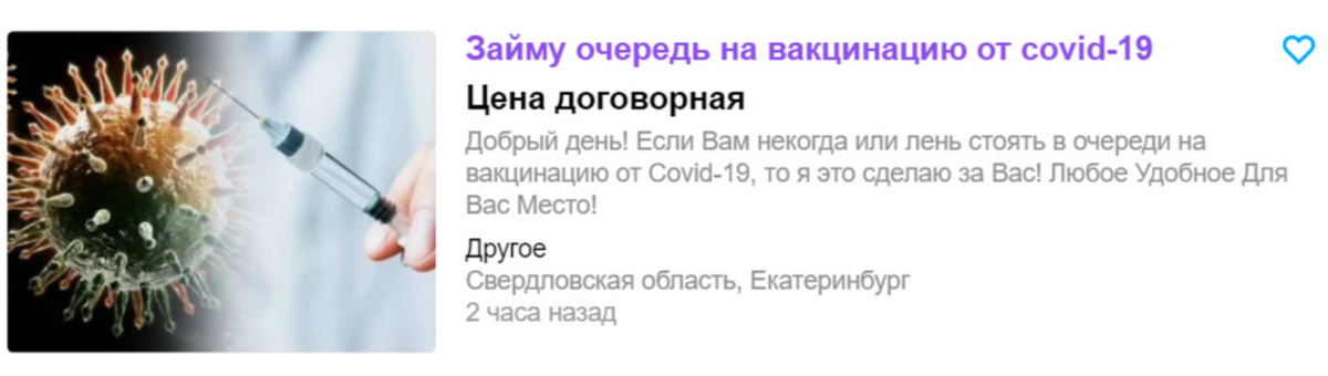 Из-за большого количества людей, которые решили получить прививку от коронавируса после начала нерабочих дней, нашлись желающие заработать и на этом. Уральцы предлагают занять место в очереди для тех, кто не любит ждать в любом пункте вакцинации.