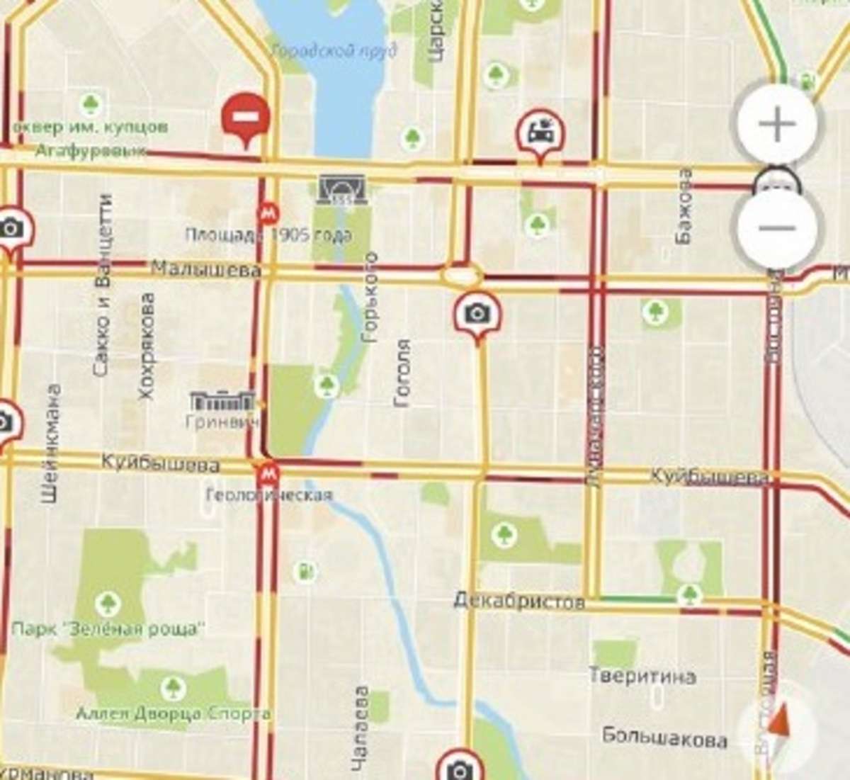 Традиционно, больше всего заторов в центре города. Стоит улица Малышева, проспект Ленина, 8 Марта, улица Челюскинцев и Куйбышева. При этом, отмечены ДТП на улицах Шаумяна, Владимира Высоцкого, Шефской и проспекте Космонавтов.