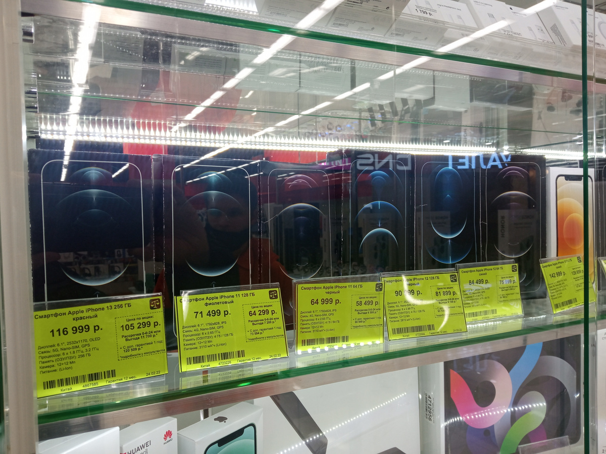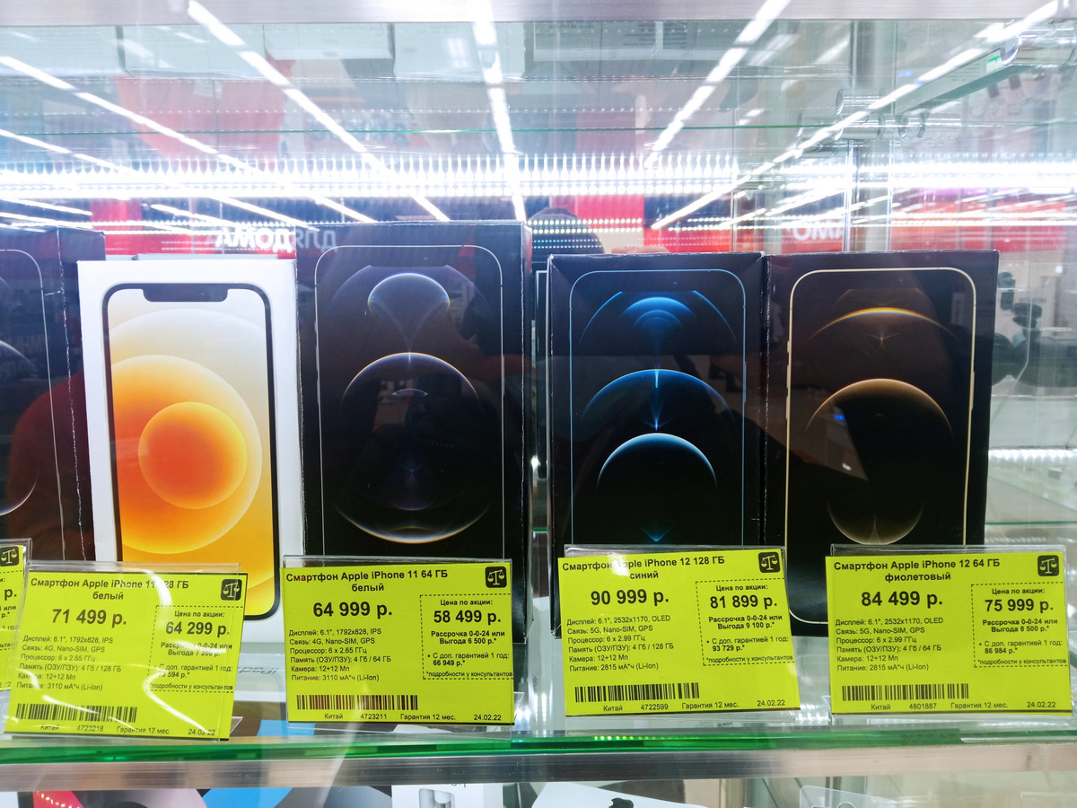 — Да, у нас вообще все подорожало. Не только цены на айфоны изменились, но и она ноутбуки, моноблоки, да практически на все. iPhone 12 на 128 гигабйат сейчас стоит 81 899 рублей, а на 256 гигабайт — 93 599, до резкого скачка он стоил 72 тысячи рублей, — рассказала «Моментам» сотрудница DNS в Екатеринбурге.