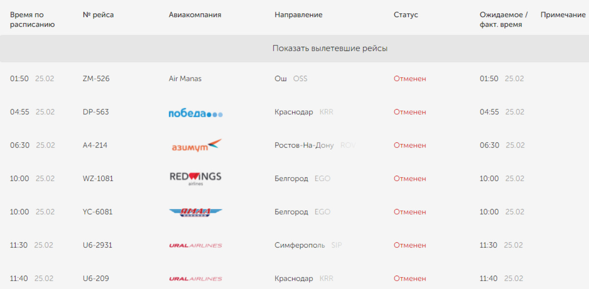 25 февраля отменили авиаперелеты из Екатеринбурга в Симферополь, Краснодар, Белгород и Ростов-на-Дону. На юг страны должны были отправиться авиакомпании «Уральские авиалинии», Red wings, «Азимут», «Победа», и Авиакомпания «Ямал».