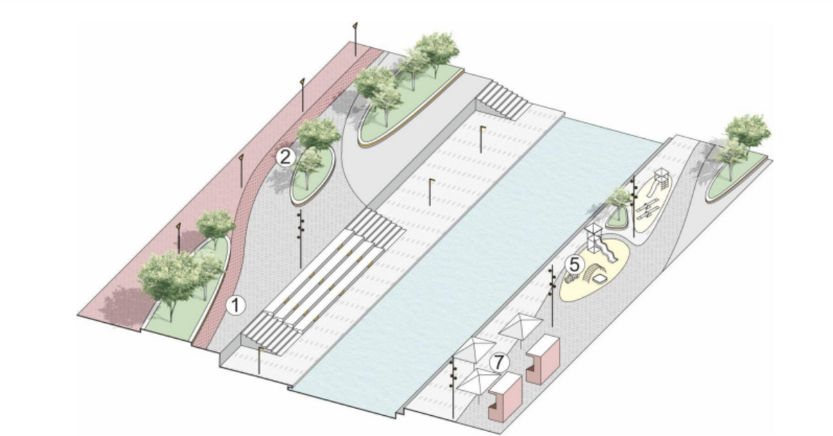 Также в разработке стандарта развития местных набережных и парков учитывалась необходимость разделить пространства на разные зоны отдыха: активный, различные детские площадки и просто уединенные места с минимум нагрузки.