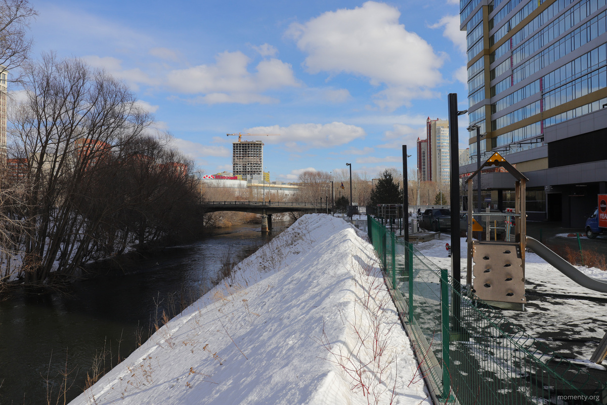 Особенно хорошо здесь будет летом. Отличный вид на набережную Исеть, откуда открывается вид на жилые дома и зеленые зоны района.