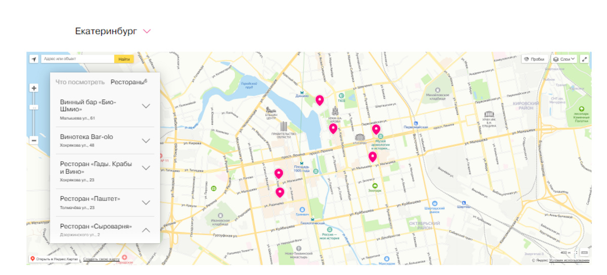 В списке от журнала оказалось более 30 городов России, и в их число вошел Екатеринбург. В гид «Большое русское вино» попали винотека Bar-olo, ресторан «Гады, Крабы и Вино», ресторан «Паштет», ресторан Si! и ресторан «Сыроварня». К каждому заведению добавлено описание, где рассказывается о концепции гастроточки и о том, с каким блюдом лучше пробовать вино.