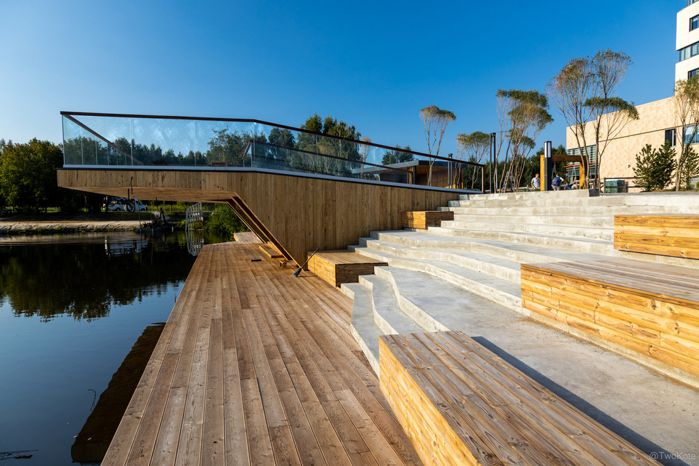 Рассказу о самом фестивале предшествовал небольшой фуршет, где в неформальной обстановке можно было пообщаться со спикерами мероприятия, а также прогуляться по набережной пруда. Отдельно отметим парящий мост над водоемом, откуда открывается невероятный вид на закат.