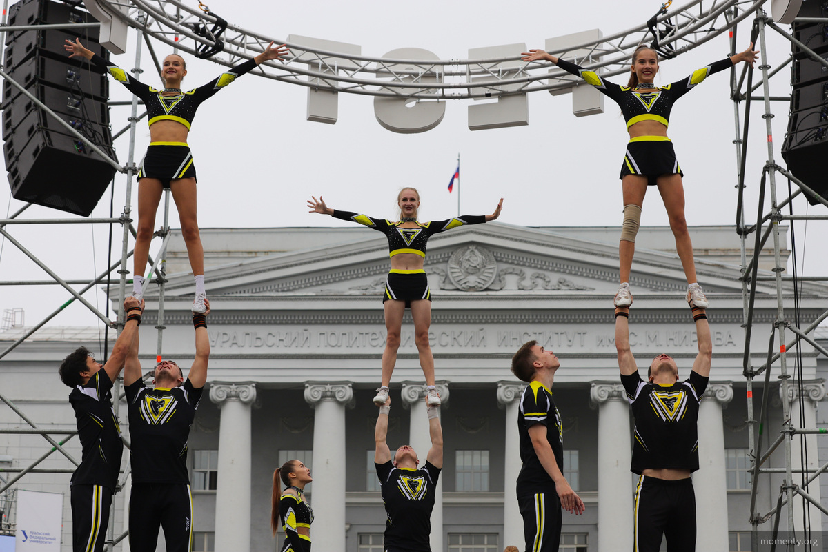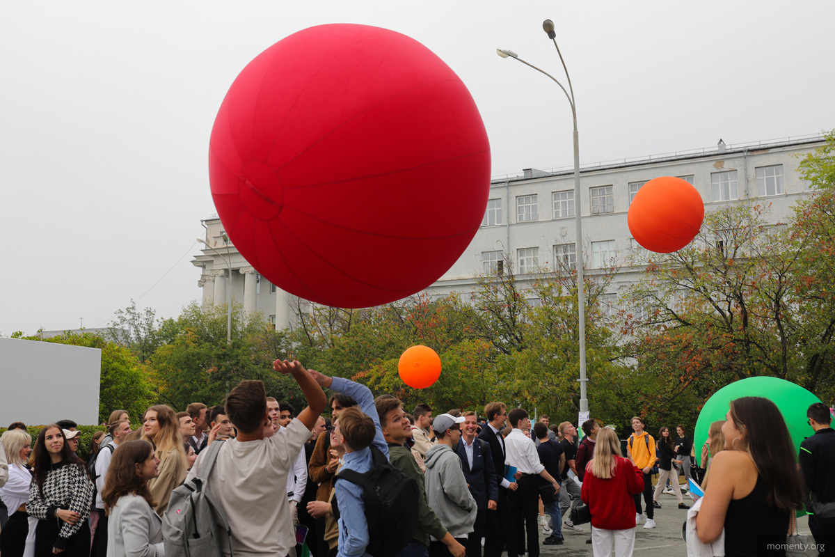Праздник начался с выхода колонн всех институтов УрФУ на главную площадь университета. В толпу студентов были запущены огромные воздушные шары. Ребята общими силами не допускали падения цветных шаров. Затем ведущий мероприятия огласил интересные факты нового учебного года в университете.