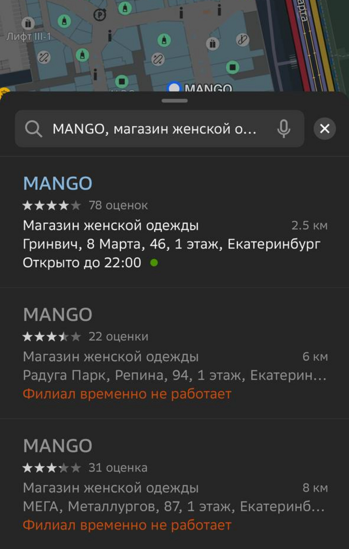 Все магазины бренда MANGO были закрыты по России, кроме франшизных точек. Так, в Екатеринбурге продолжил работу только один бутик, в ТЦ «Гринвич». В ТЦ «Мега» и «Радуга парк» MANGO закрыт на неопределенный срок.