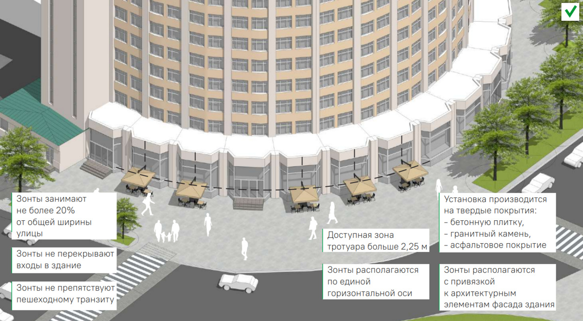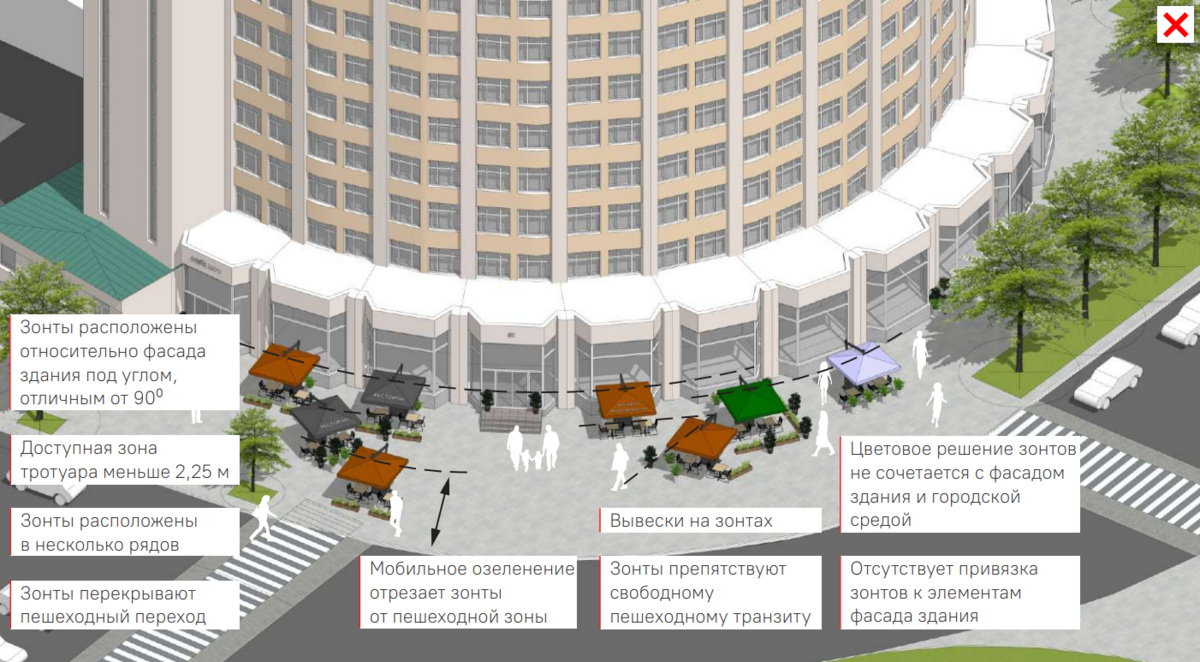 Согласно руководству, летние зоны должны будут не только гармонично смотреться на фоне уличного контекста, но и не мешать пешеходному потоку. В Екатеринбурге встречаются случаи, когда веранда мешает проходу и захватывает большую часть тротуара.