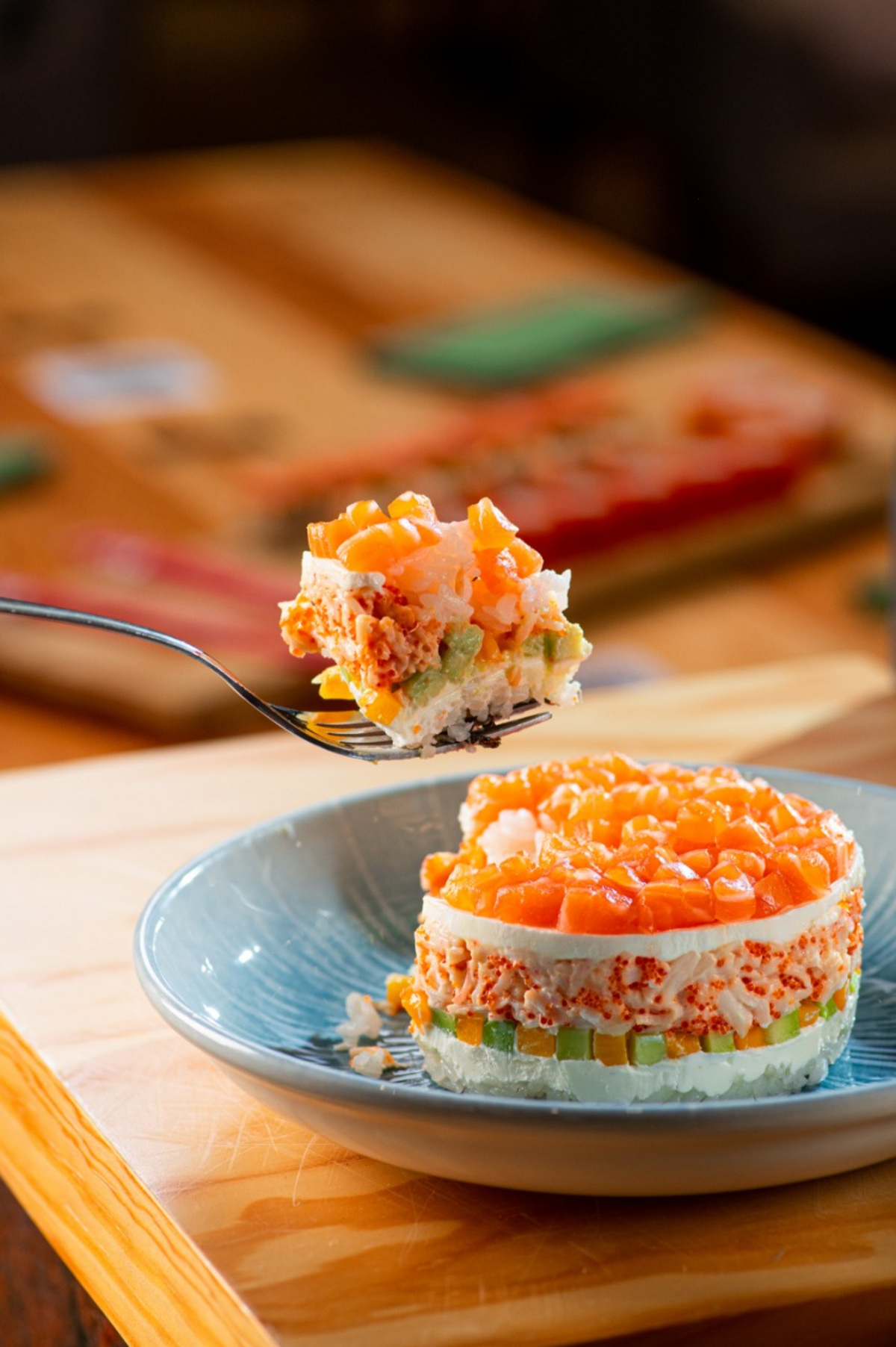 — Милый бенто-торт с лососем, манго и авокадо идеален, чтобы съесть его вдвоем, наслаждаясь вкусом. В составе — лосось, краб-микс, сочный манго, авокадо, нежный сыр.