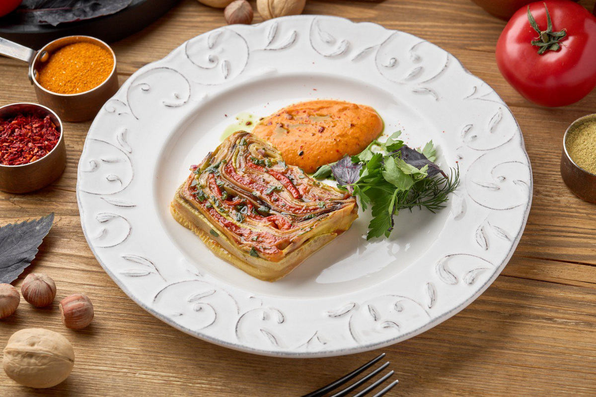 — Овощной рататуй с мухаммарой и соусом из свежих трав;