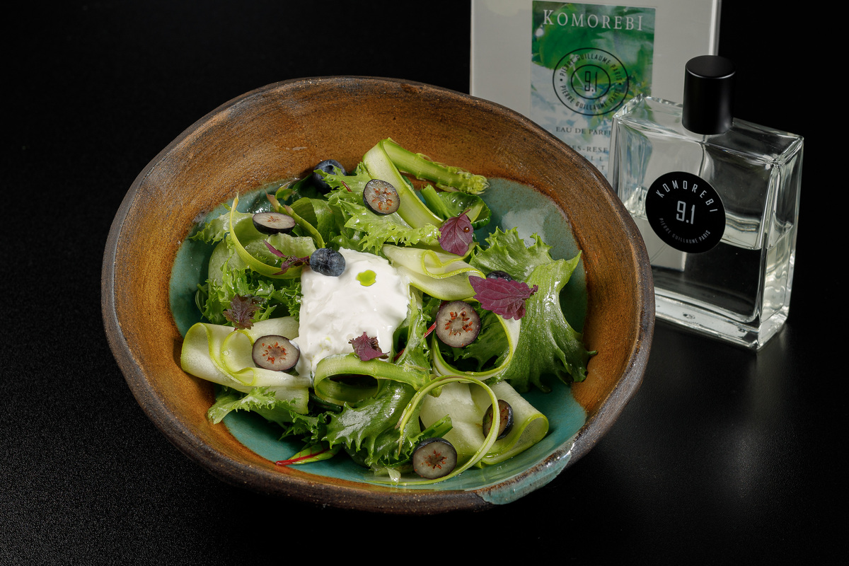 — Перед подачей салата на аперитив подают лолу из апельсина и моркови — овощной чупа-чупс. В летнем салате свежесть цукини и спаржи дополняет сливочный вкус страчателлы. Раскрыть вкус блюда поможет парфюм PIERRE GUILLAUME PARIS;