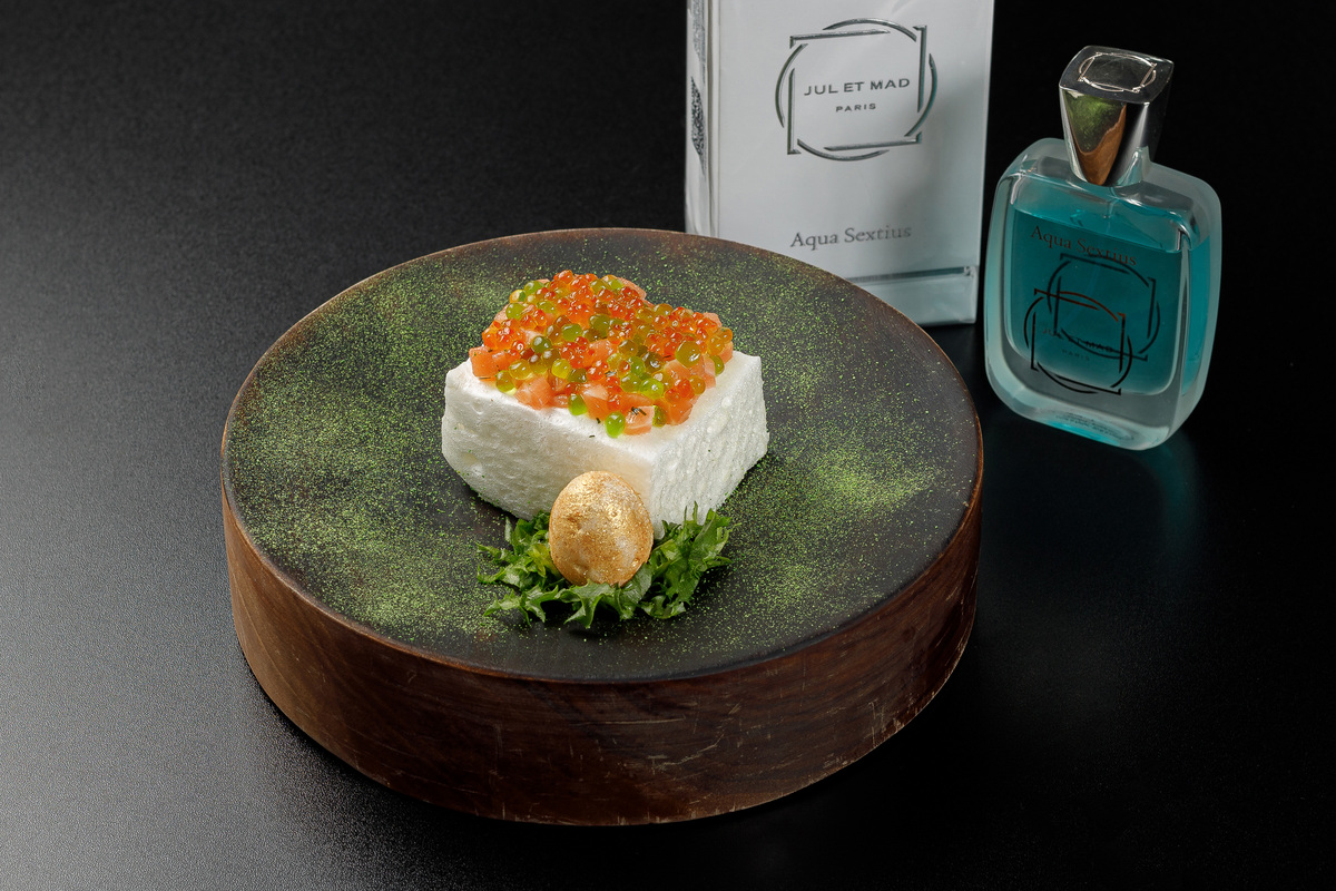 — Тар-тар из свежего лосося подают на подушке из нежного маршмеллоу. Блюдо вдохновлено парфюмом Jul et Mad;