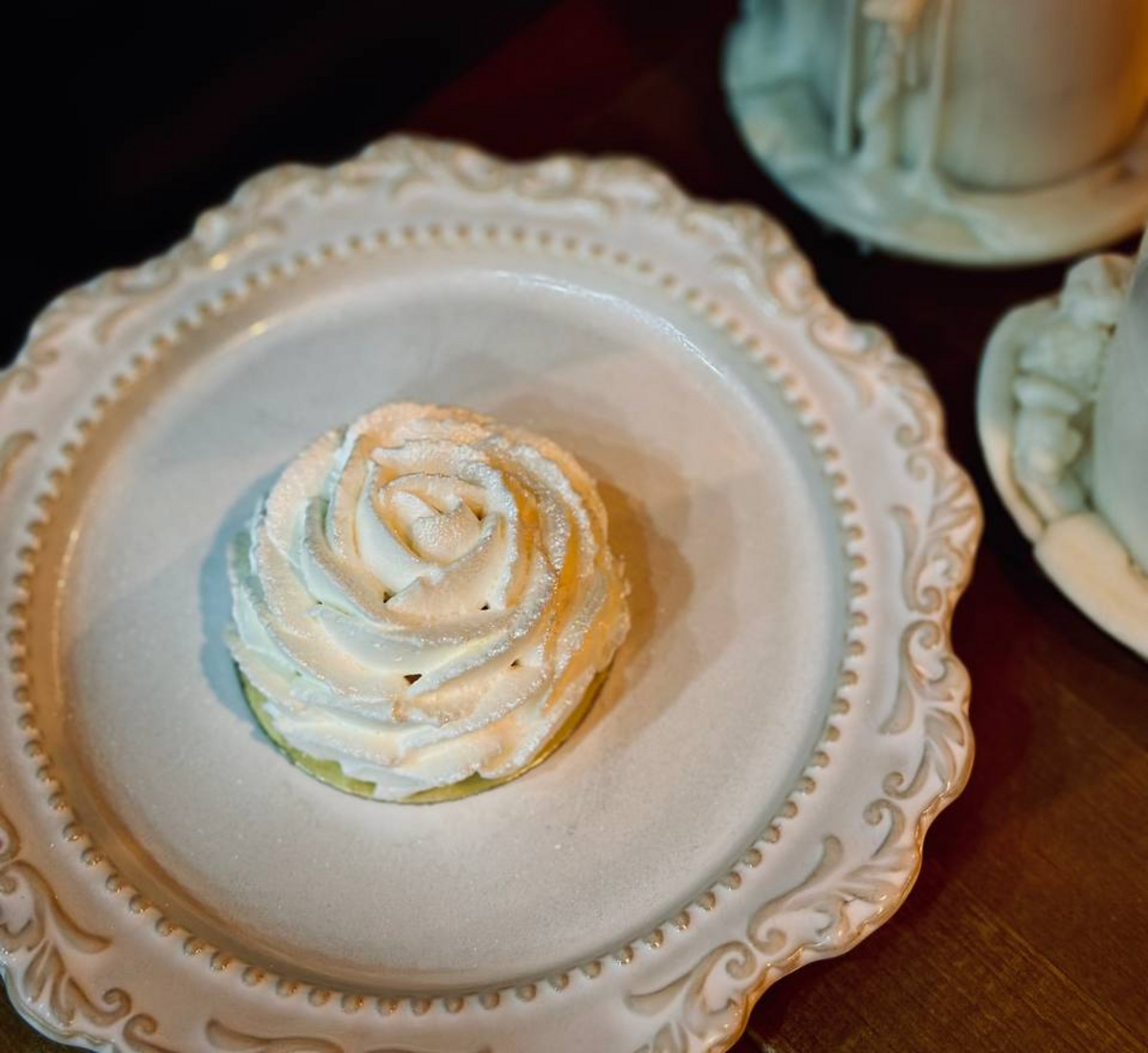 — В ресторане гостям приготовили десерт, вдохновленный парфюмом от Jacques Fath. Фондан из матчи с нежной сердцевиной подают с освежающим сорбетом из отвара свежей соломы;