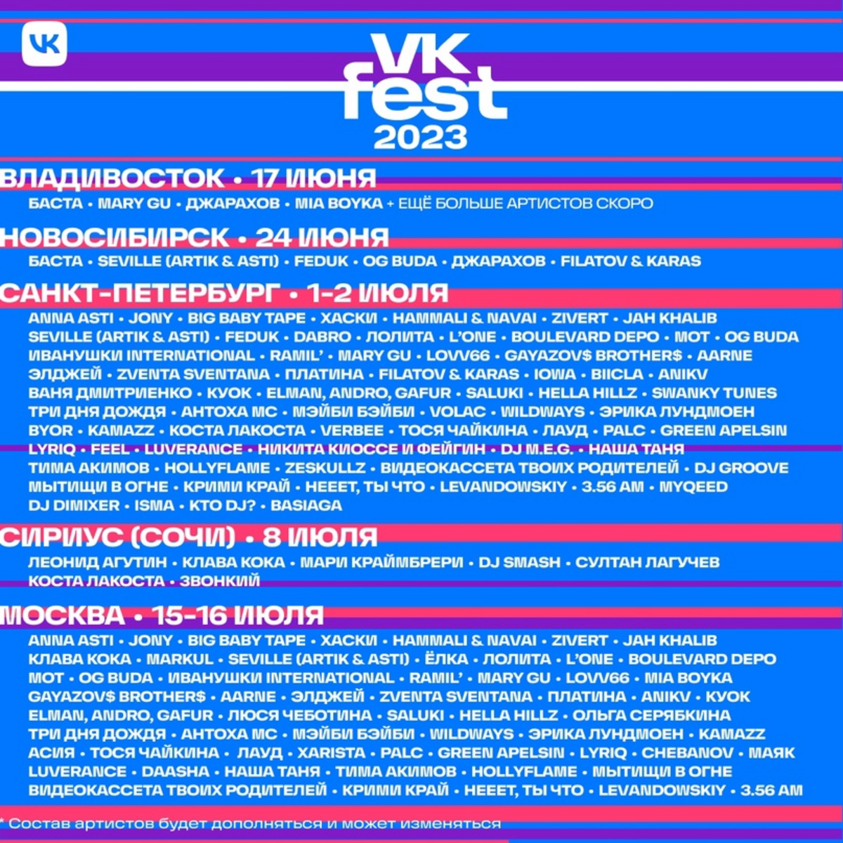 Это не конечный список артистов, он будет пополняться. Позже представят других артистов, известных спикеров и блогеров. VK Fest продлится целый месяц — во Владивостоке фестиваль состоится 17 июня, в Новосибирске — 24 июня, в Питере — 1 и 2 июля, в Сочи — 8 июля, а в Москве — 15 и 16 июля. Билеты можно приобрести на официальном сайте феста, их стоимость начинается от 3500 рублей.