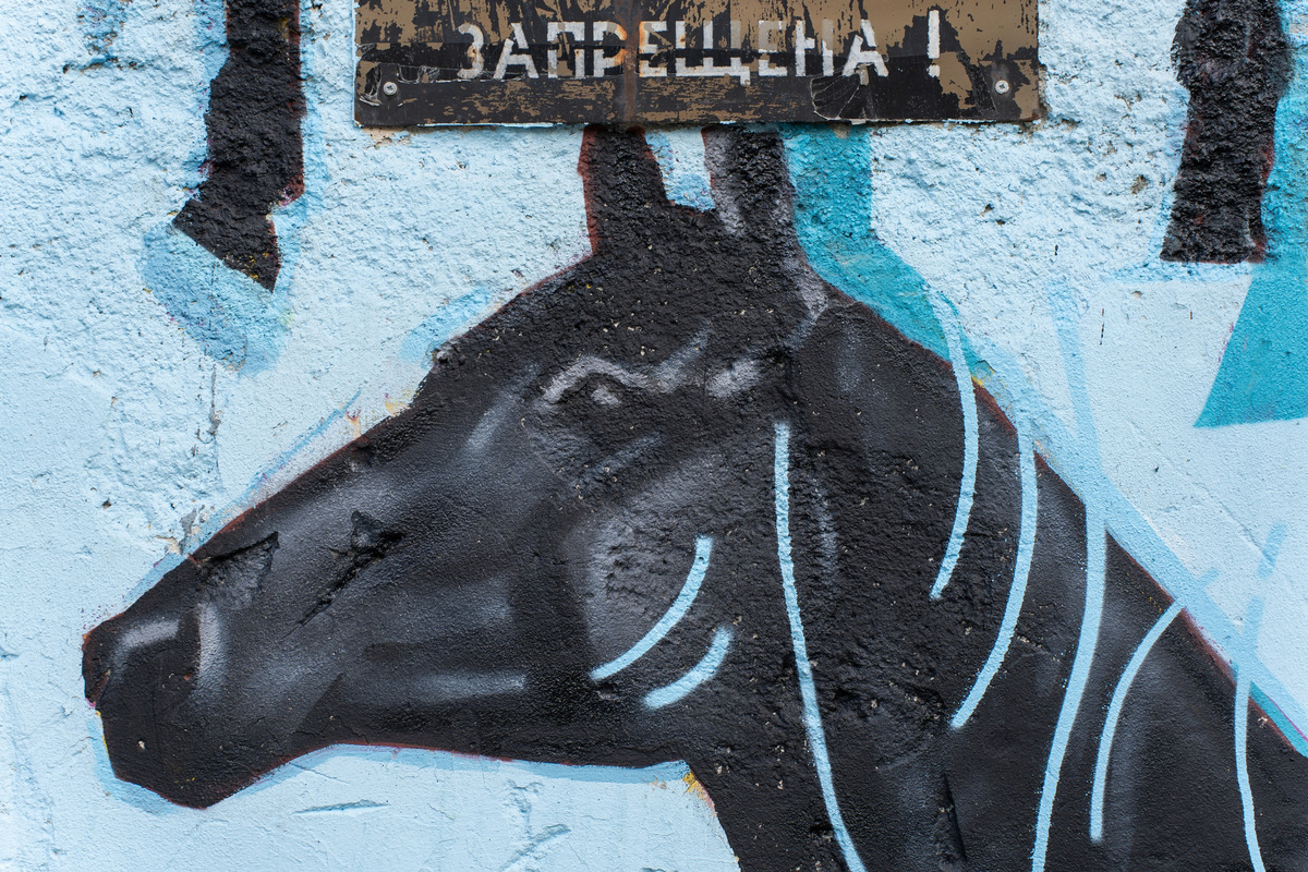 — В работе Нади можно увидеть переплетение различных элементов и жанров. На четырех стенках запечатлены образы лошадей, геометрические объекты, абстрактные фигуры и шрифты, и все это объединено в один коллаж. Надя рассказывает, что в ее работах элементы из типографики и графического дизайна сочетаются с античными мотивами, — рассказали «Моментам» представители STENOGRAFFIA.