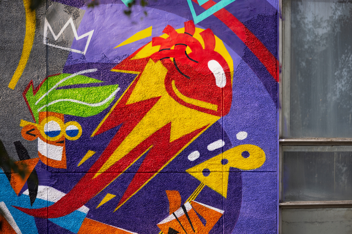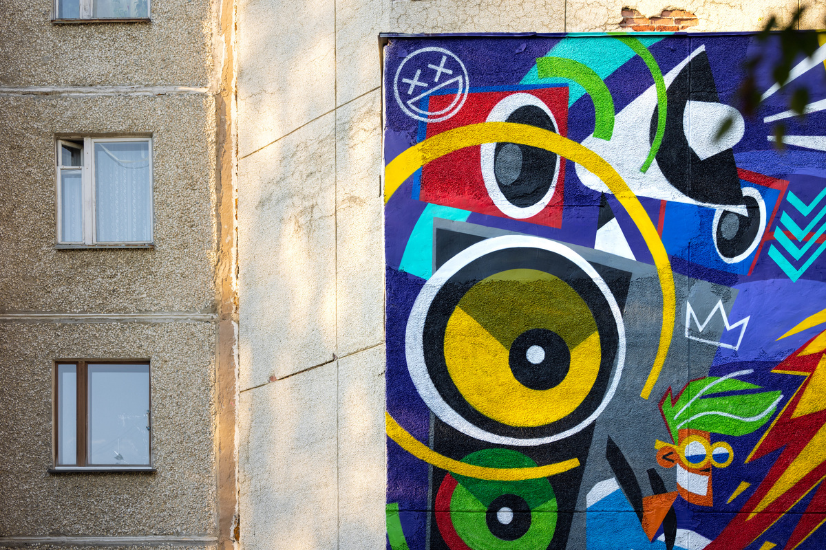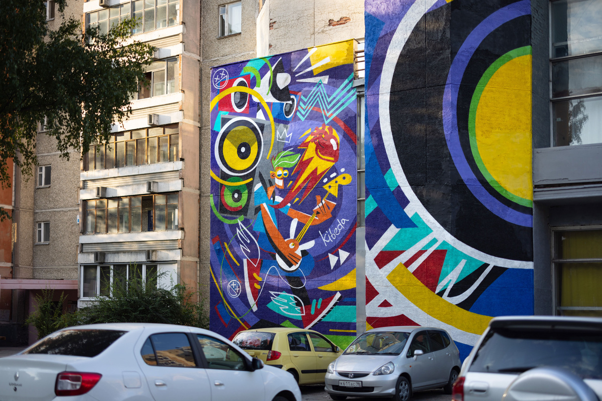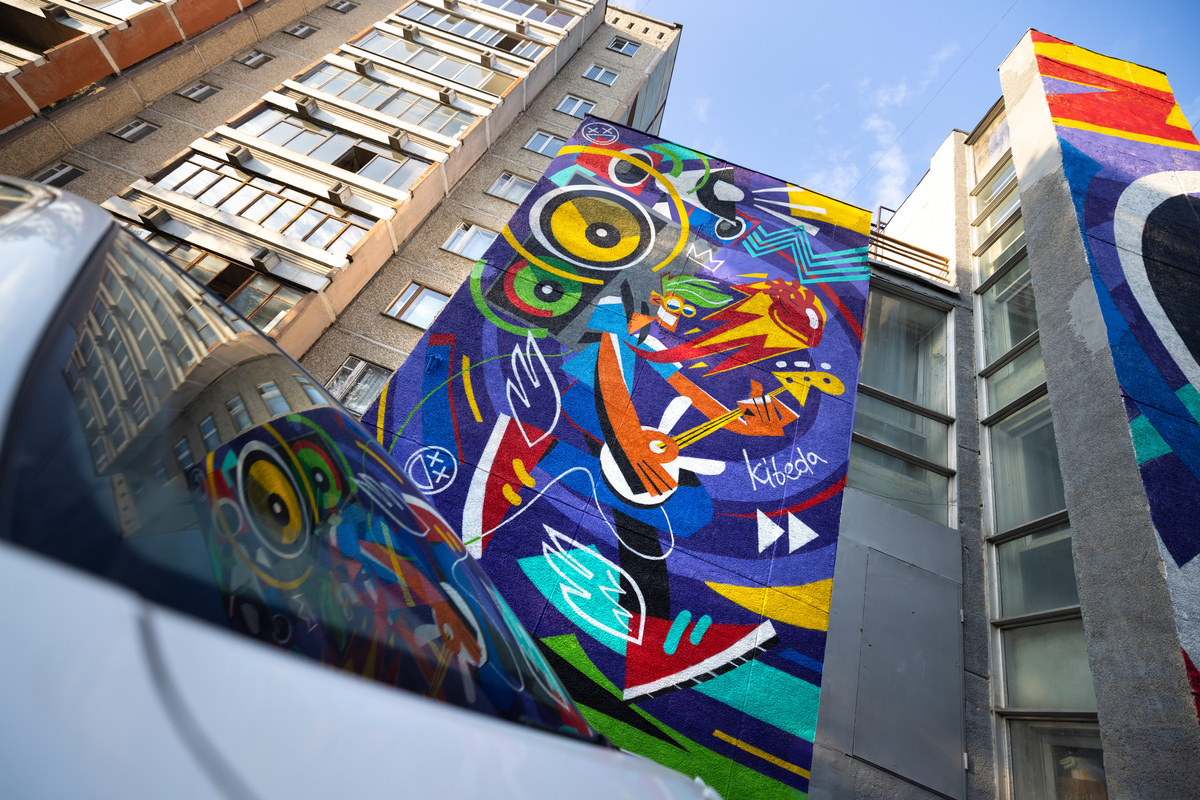 Мурал, состоящий из трех элементов, можно увидеть на фасаде дома на улице Высоцкого, 22. Как рассказал художник, через простые формы он стремился передать динамику музыки и создать веселый, яркий стрит-арт.