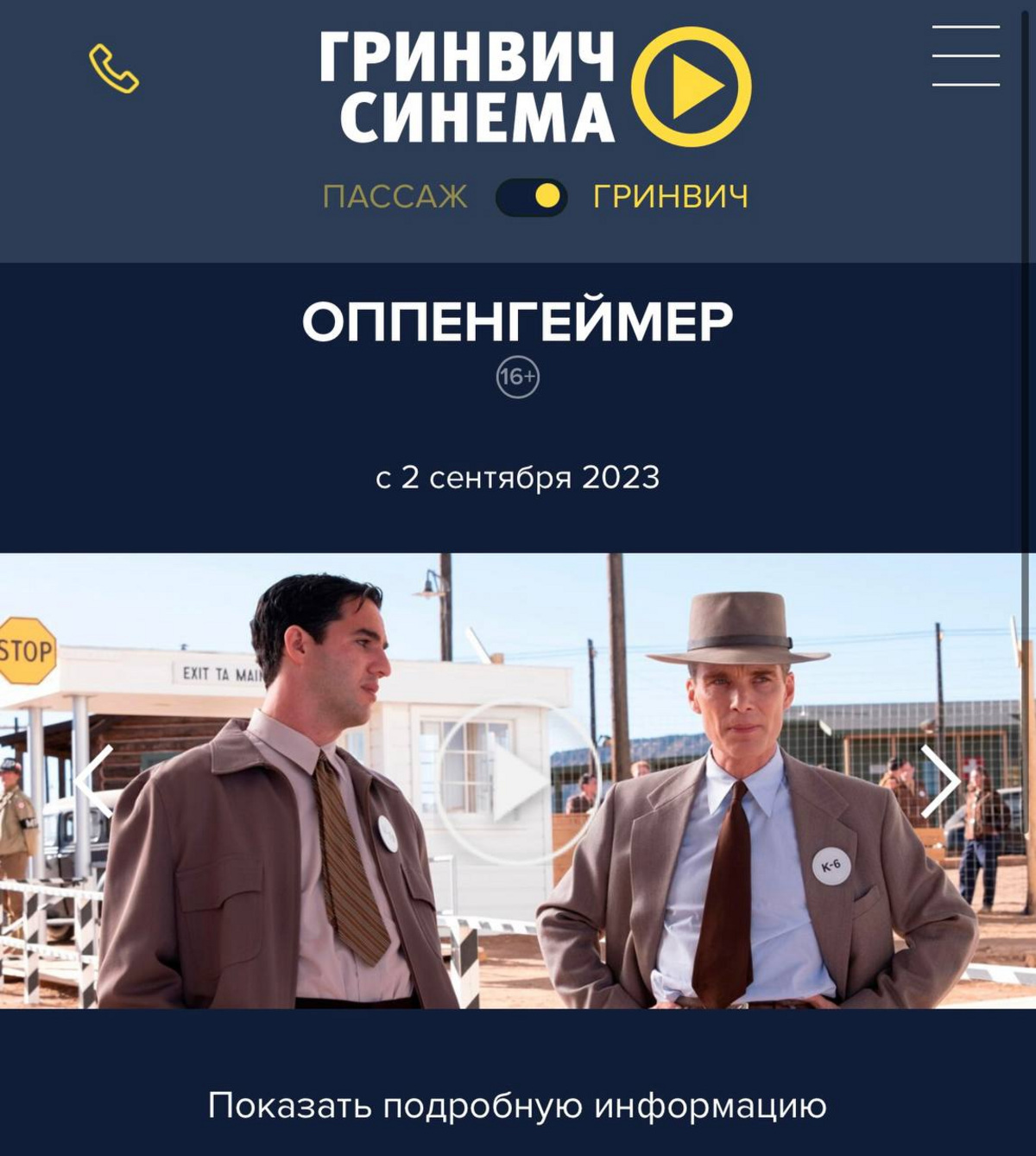 — Срочная информация! С завтрашнего дня в кинотеатрах «Гринвич» и «Пассаж Синема» покажут горячо ожидаемый «Оппенгеймер». Фильм Нолана в представлении не нуждается, и кажется планы на выходные уже появились, — рассказали в Telegram-канале «Гринвича».