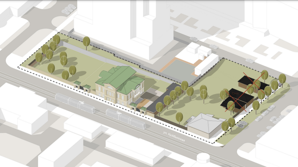 Со стороны перекрестка Куйбышева — Горького будет разбита зона для мероприятий и более активного отдыха. Благодаря естественным перепадам высоты на этом участке появится амфитеатр и сцена с проектором. Площадка будет рассчитана примерно на 150 человек.