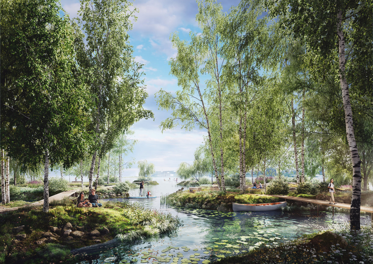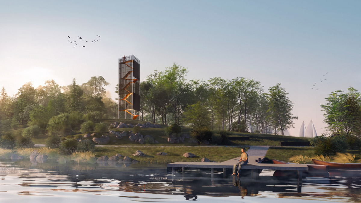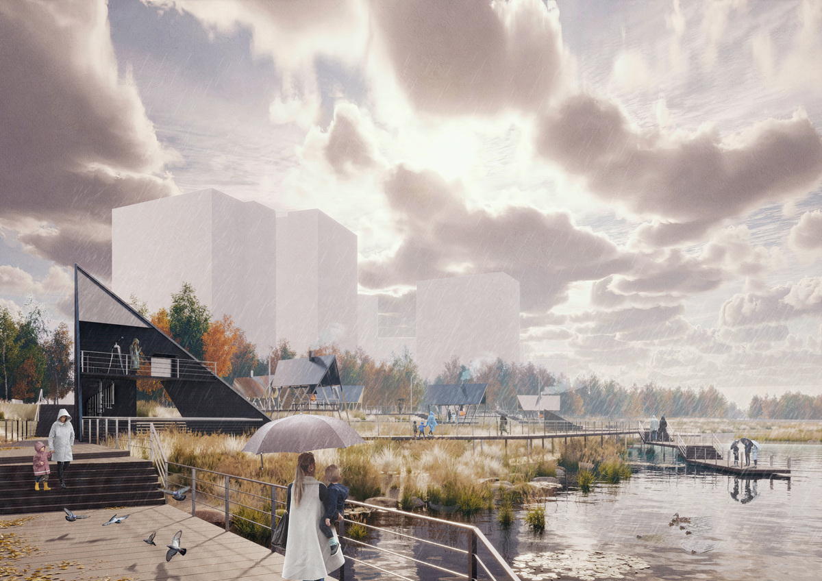 Проектировщики вспомнили и о природной состоявляющей. Для гостей территории предусмотрели пирсы, «укрытия рыбака», панорамные локации, тропинки ниже уровня воды и домики для наблюдения за птицами.