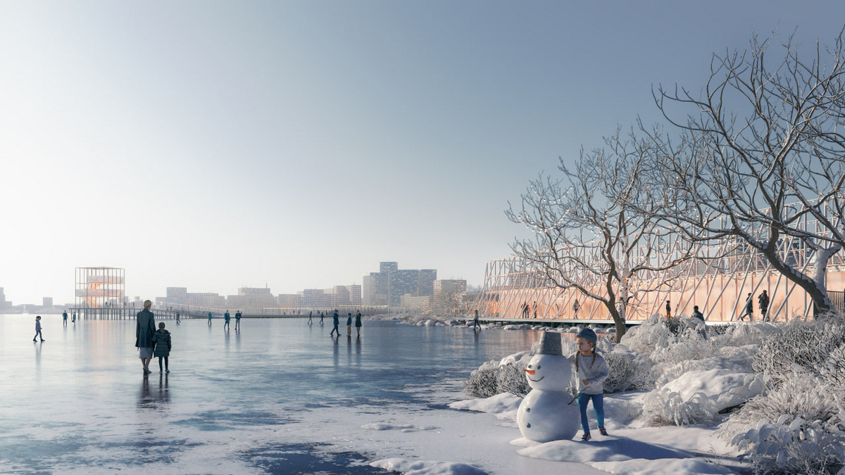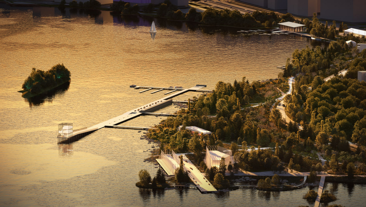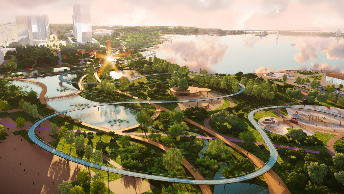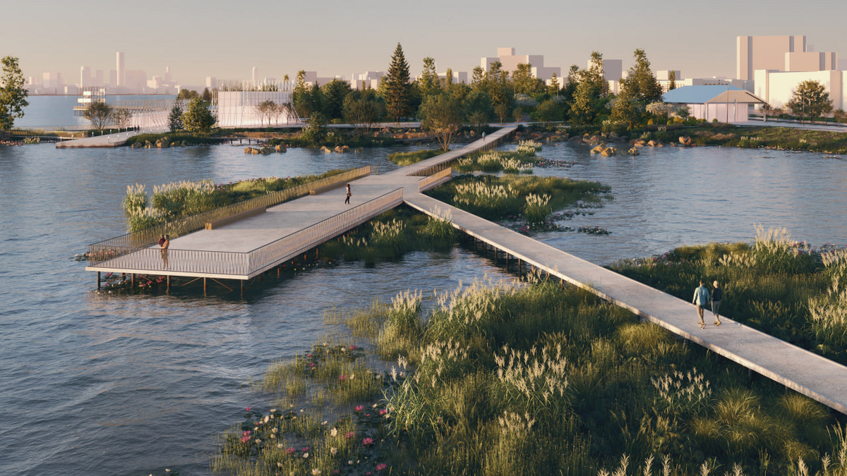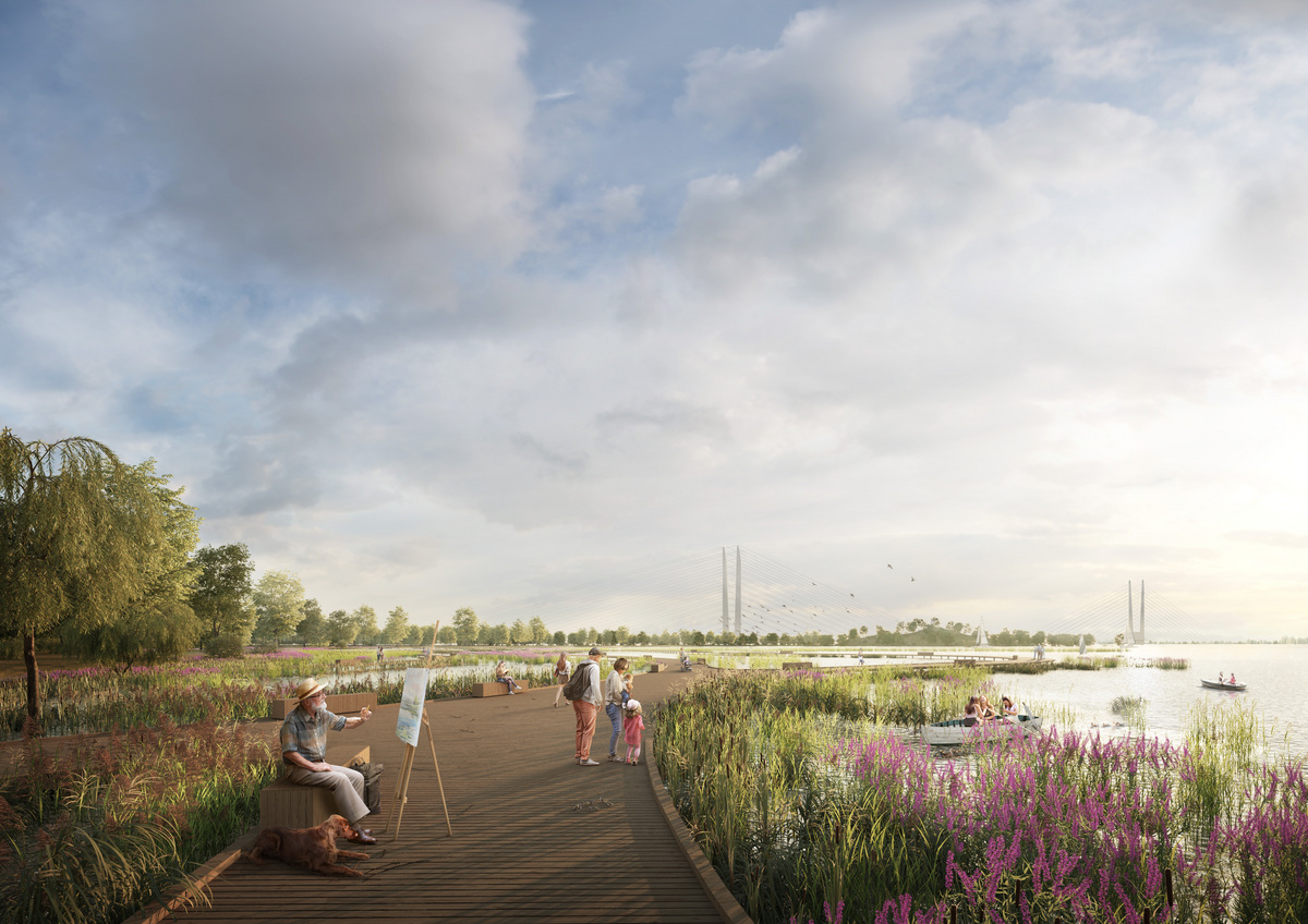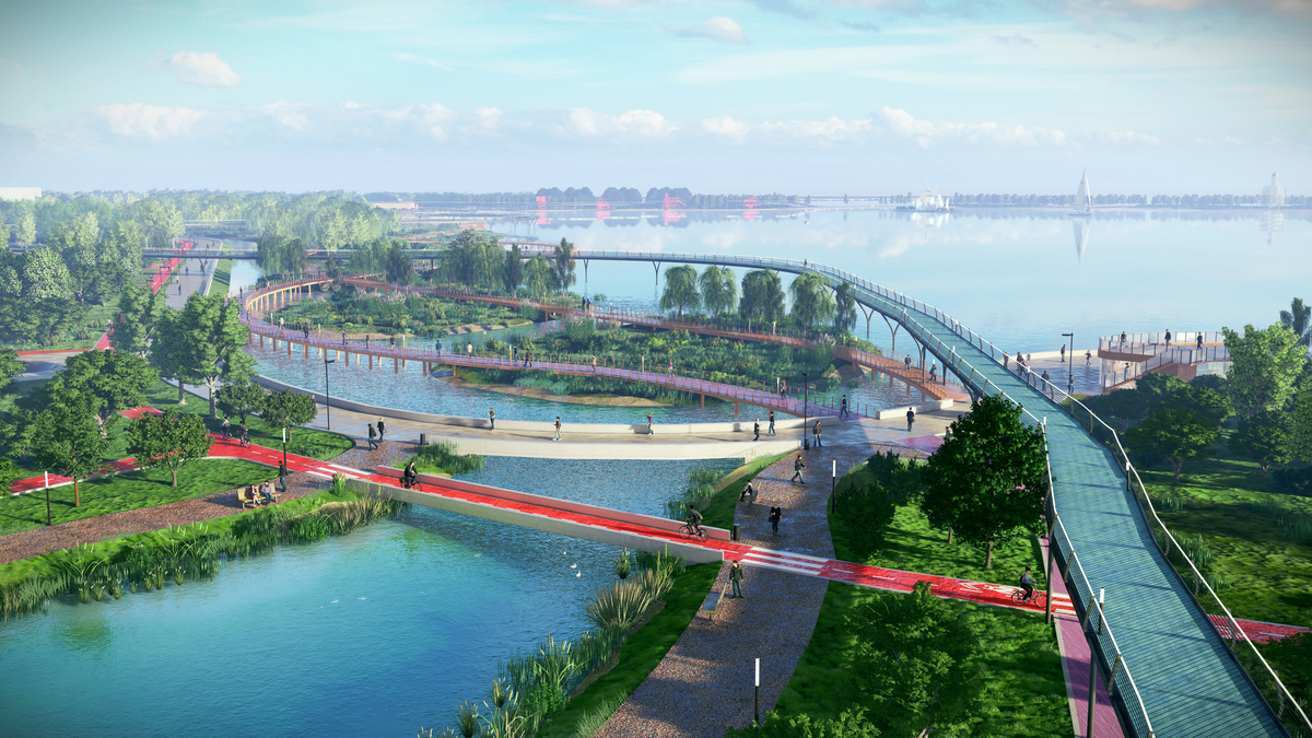 Архитекторы делают ставку на увеличение количества водных зон и сети троп по набережной и мостам. Команда предлагает сохранить существующее русло, создать межквартальные каналы с каскадом прудов и обеспечить доступ на природные острова.
