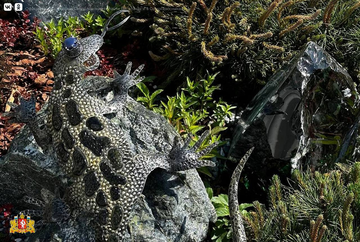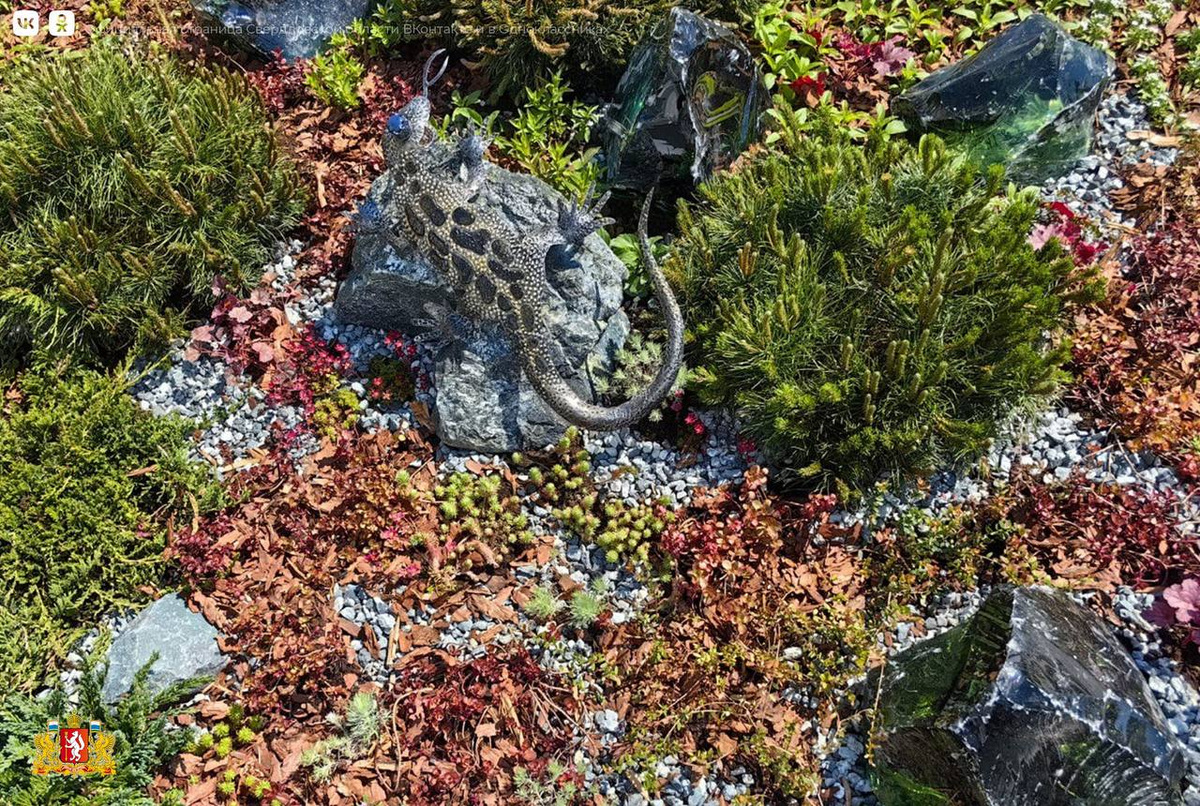 Уральская композиция создана с использованием местных минералов, декоративных камней и характерных для региона растений — сосны Пумилио, брусники, клюквы, дербенника, можжевельника, алиссума, камнеломки Арендса. В центре объекта сидит ящерица с короной из «Малахитовой шкатулки». Гости фестиваля отмечают, что свердловский арт-объект виден издалека благодаря сверканию кварца.