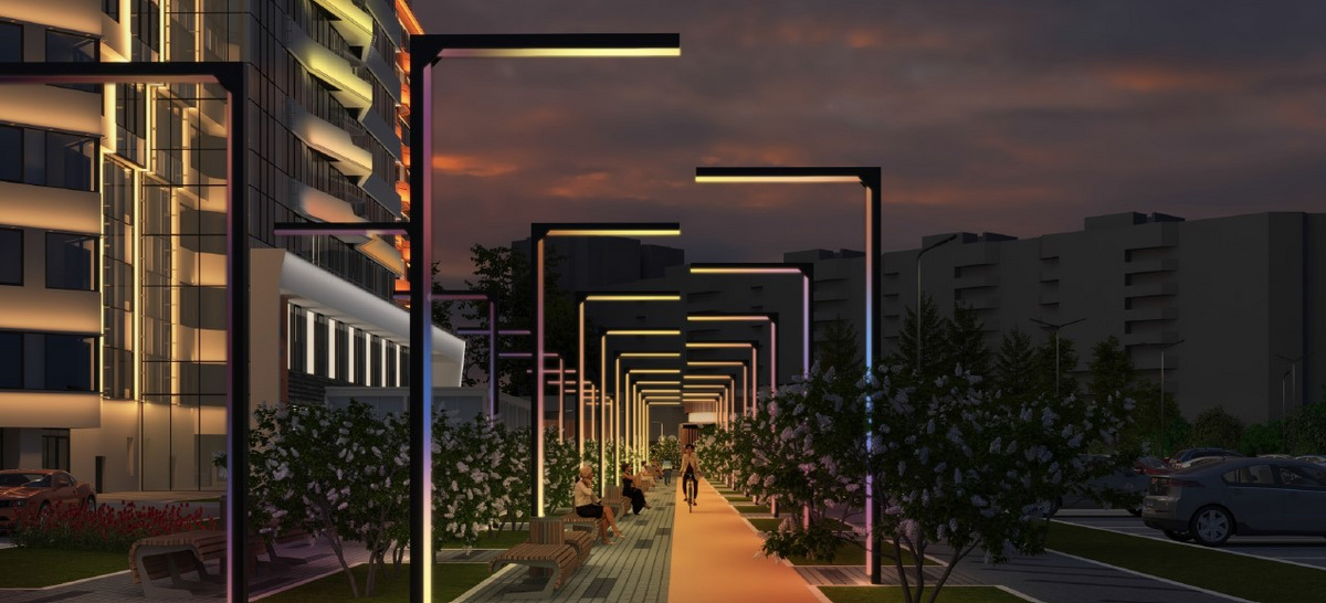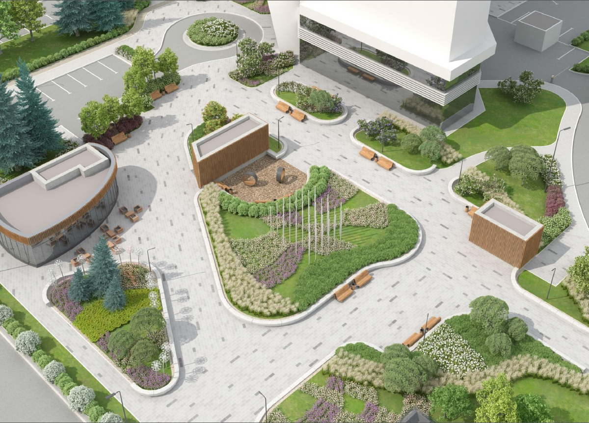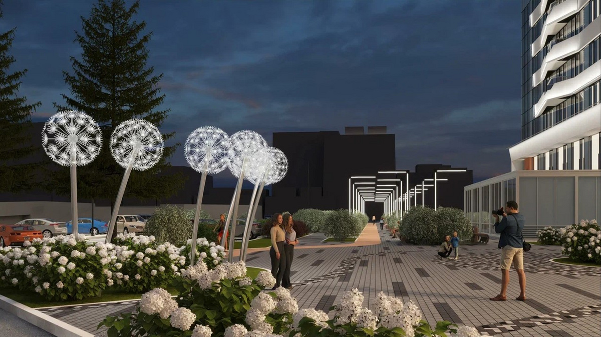 Украсят сквер световые инсталляции в виде одуванчиков и фонтан, излучающий свет. А вечером за атмосферу будут отвечать галереи из светящихся Г-образных опор. Также здесь посадят свыше 10 тысяч растений, 6700 кустарников и 135 деревьев. Для горожан планируют обустроить кафе.