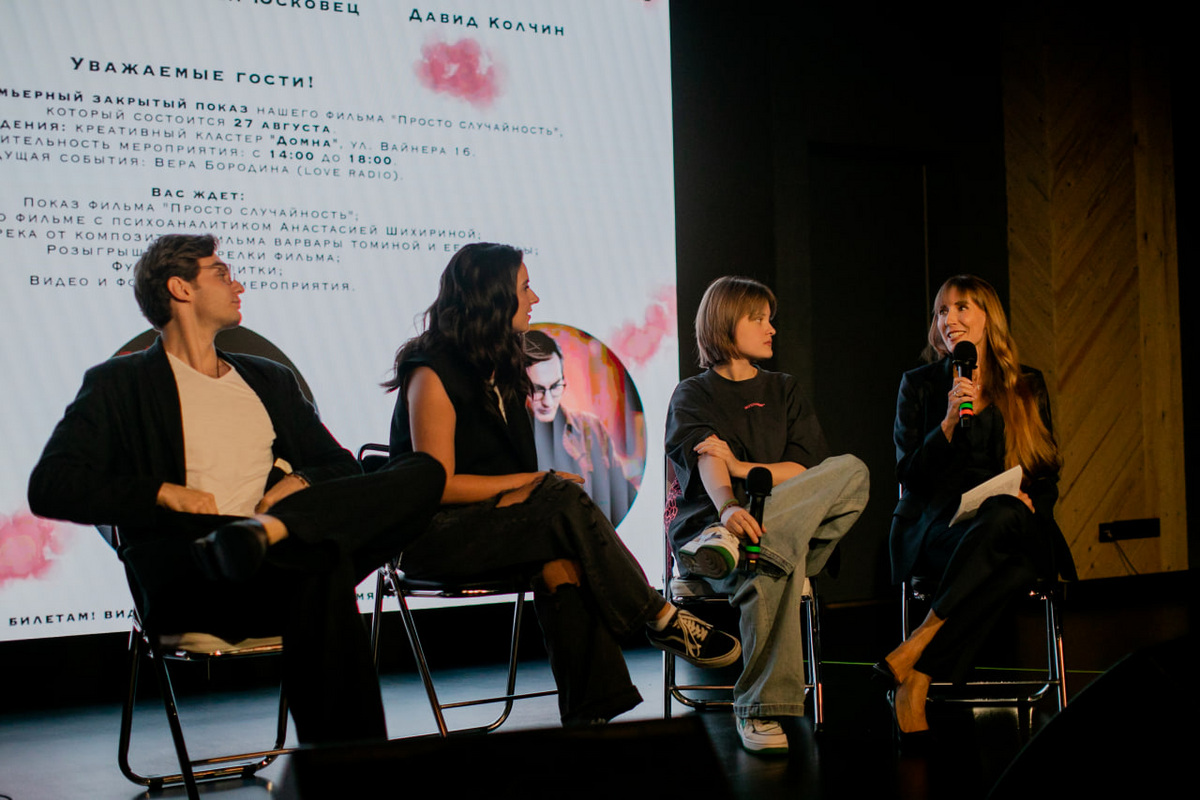 Молодой режиссер Софья Косажевская сняла фильм в поселке Новая Рассоха, расположенном неподалеку от Екатеринбурга. Главные роли в киноленте исполнили московские актеры Василина Юсковец, Мариель Хлендовска и Давид Колчин. Пришло время запустить как воздушного змея работу в народ: на закрытом показе в «Домне» зрители впервые увидели сотканный фильм «Просто случайность».