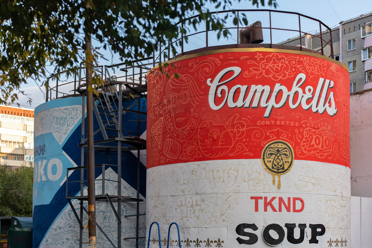 В рамках проекта Stenograffia Revision в Екатеринбурге восстановили легендарные бочки «Банки Сгущенки и супа Campbells’s». Реставрацией работы, созданной новосибирской командой TAKNADO, занимался художник Миша Мак.