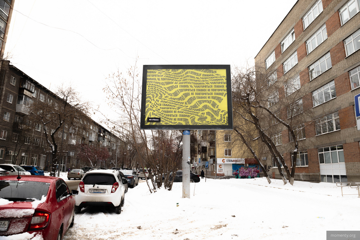 Работа сделана совместно с «Т-банком». Проект по установке арт-объектов разных форматов проходит во многих городах Росссии. Все работы связаны общей темой трансформации и эволюции. Баннер расположился на улице Мамина-Сибиряка, 38.