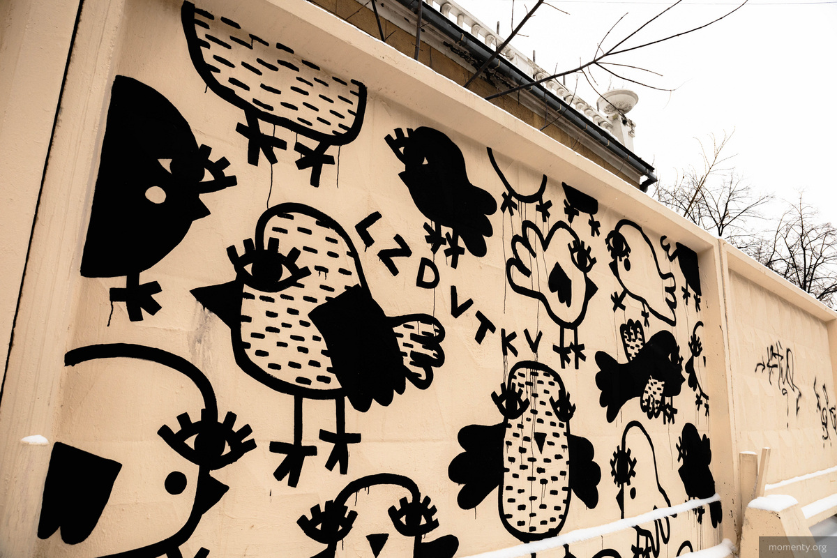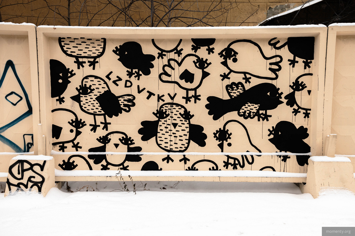 — Птички-персонажи сначала были списаны с типажей жителей Перми, но потом я поняла, что такие городские жители есть везде. Обратная связь от зрителей в Екатеринбурге меня очень порадовала, все-таки столица стрит арта, тут это целая культура. Рисунок на заборе был первый такой масштабный для меня на улице, да и его создание пришлось на ветреный дождливый октябрь. Но опыт получился очень интересным, хотя я не до конца осталась им довольна, — поделилась с «Моментами» художница Лиза Девяткова.
