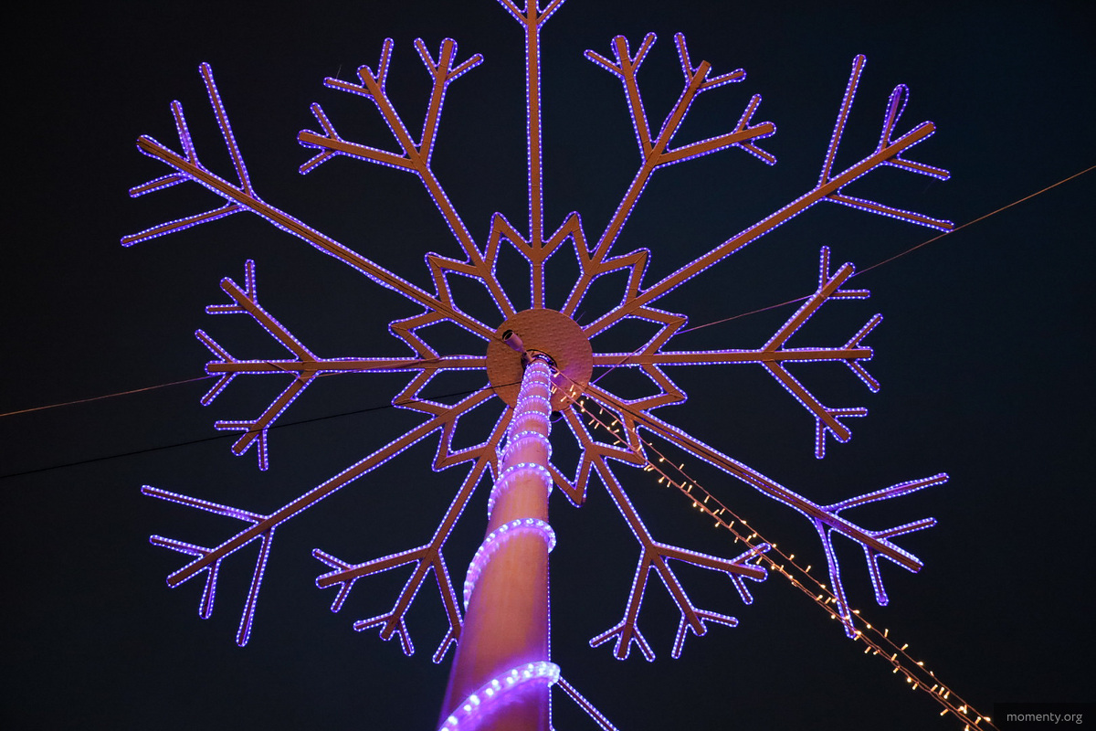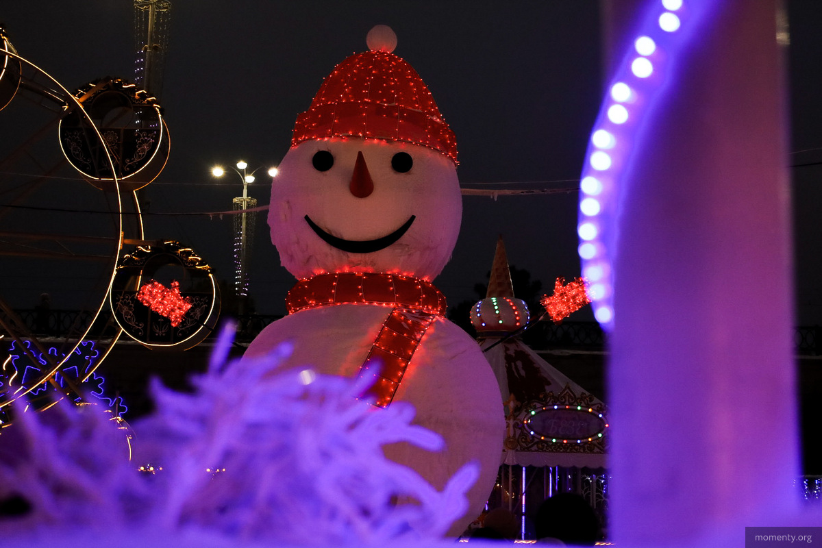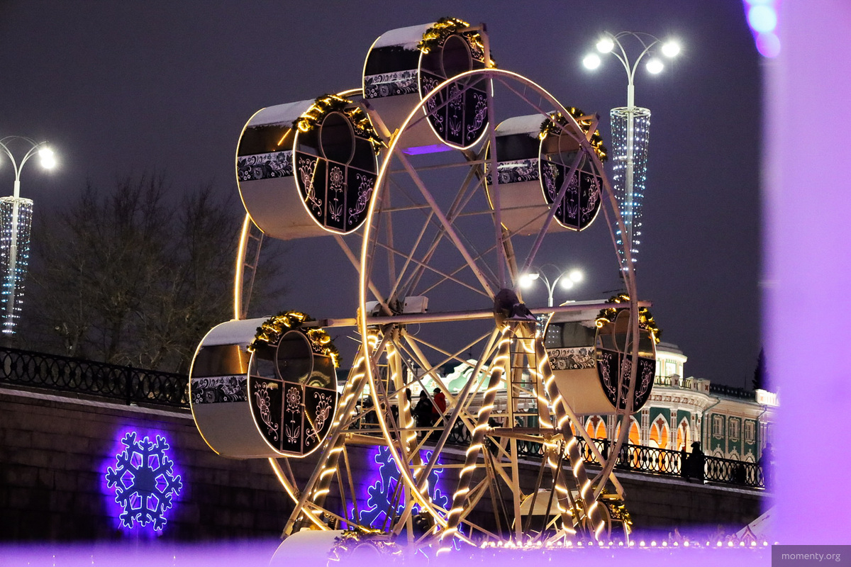 По обеим сторонам Исети установили горки разных размеров. Городок украсили ледовым лабиринтом и тоннелем из гирлянд. В центре сквера работают колесо обозрения и карусель.