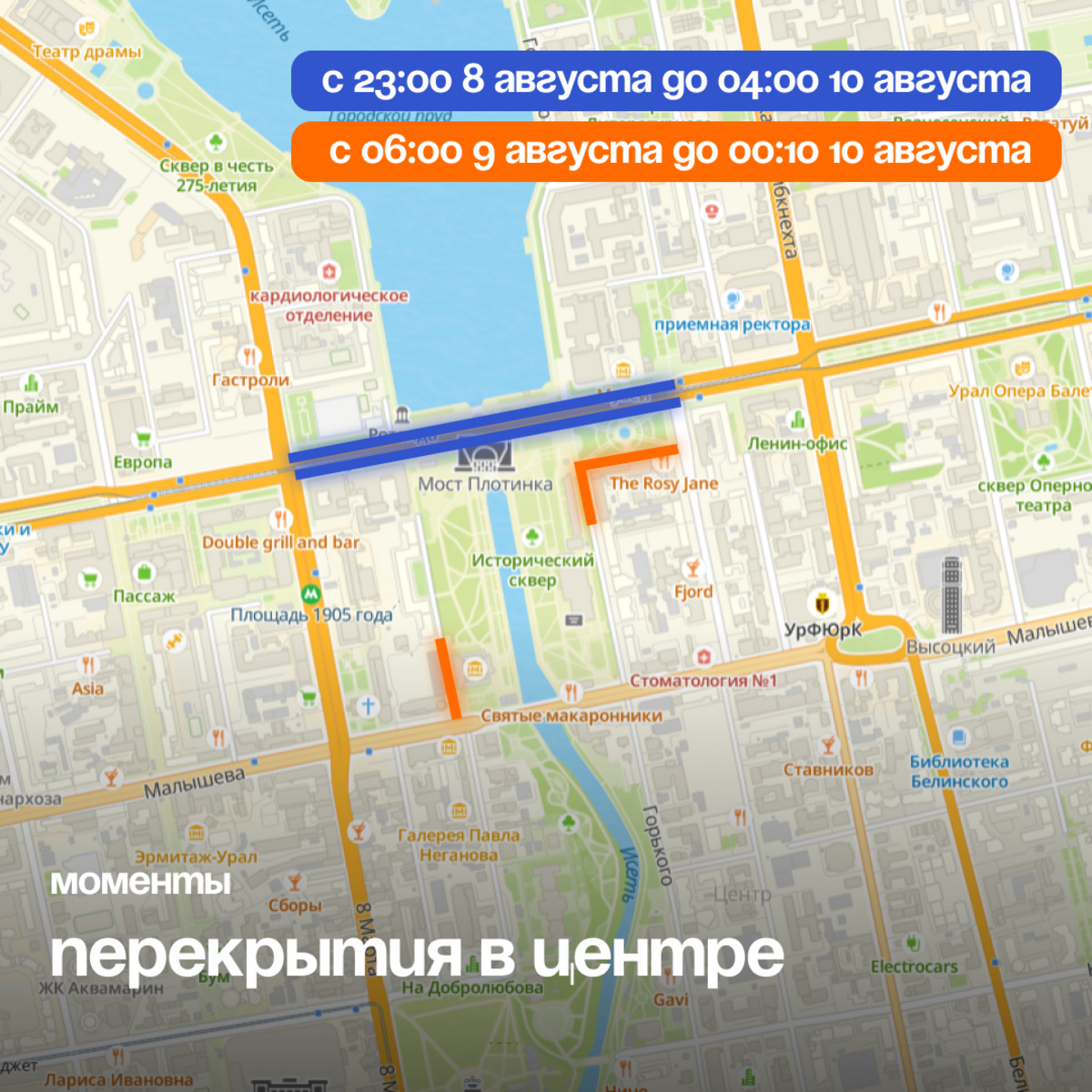 Проезд запретят по проспекту Ленина (от 8 Марта до Пушкина) с 23:00 8 августа до 04:00 10 августа. Также ограничения будут действовать на участках от улицы Пушкина до дома № 27 по Горького и от Малышева до здания № 4 по Воеводина — дороги закроют с 06:00 9 августа до 00:10 10 августа. На время празднования Дня строителя также введут ограничения на парковку.