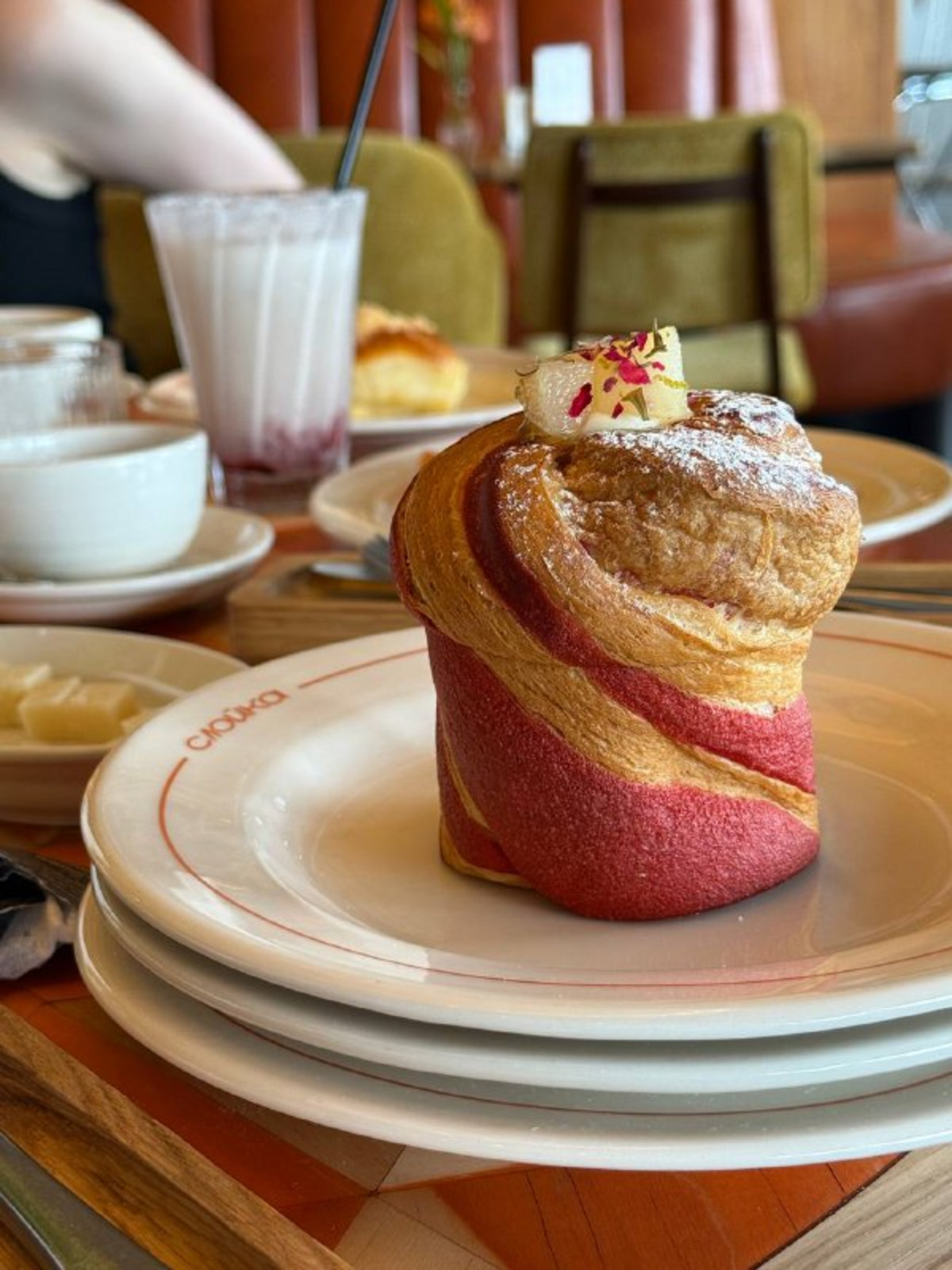 — Витрина с выпечкой обновляется несколько раз в день. Кроме свердловских слоек на одной из трех таких витрин: круассаны, трубочки с ванильной меренгой, пончики, булки с яблоками и кардамоном и другая выпечка. На второй витрине — трендовые десерты, среди которых оранжевый Labubu с манго и конфета свердловский рыжик. На отдельной витрине есть упакованная еда, которую удобно взять с собой, — рассказали «Моментам» представители заведения.