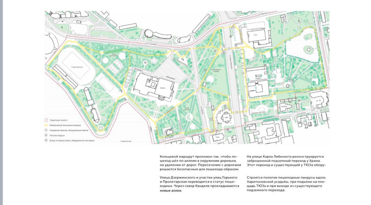 Чтобы объединить территорию, необходимо сделать несколько улиц пешеходными. Представители проекта предлагают поменять назначение Дзержинского, а также отдельных участков Горького и Пролетарской. Примерная площадь парка составит 20 гектаров — ее разделят на несколько зон. Главным планируют сделать пространство у спорткомплекса — там появится возможность проводить фестивали, концерты и другие городские активности.