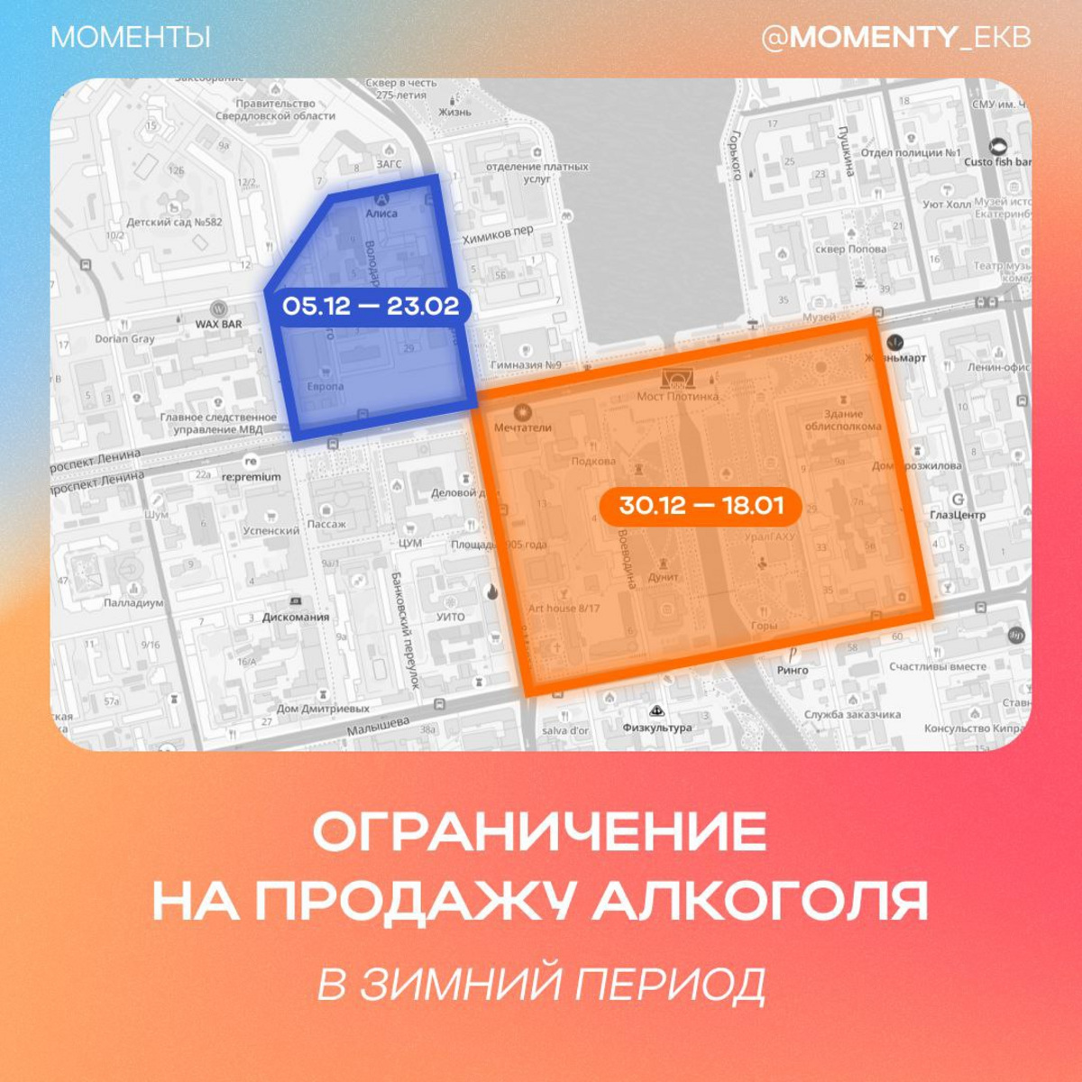 С 5 декабря 2025 года по 23 февраля 2026 года продажа запрещена с 10:00 до 23:00 в квадрате Вайнера — Антона Валека — 8 Марта — проспекта Ленина. В новогодние праздники с 30 декабря по 18 января аналогичные меры с 08:00 до 23:00 распространятся на территорию Малышева — 8 Марта — проспекта Ленина — Пушкина.