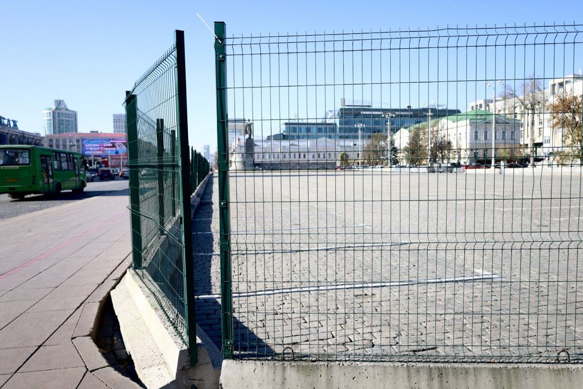 На главной площади Екатеринбурга началась подготовка к зимнему сезону. Территорию уже обнесли забором, чтобы заняться работами по установке катка.