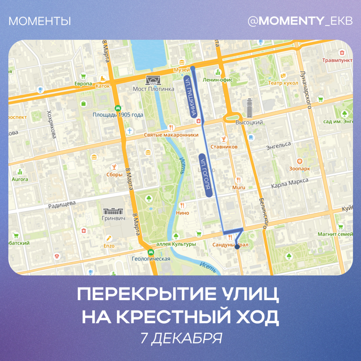 Закрыты будут следующие улицы: Розы Люксембург (от Свято-Троицкого кафедрального собора до Куйбышева), Гоголя (от Куйбышева до Малышева) и Пушкина (от Малышева до площади Труда). Ограничения на проезд были введены в Екатеринбурге еще на одном участке. Движение по Комсомольской должны были открыть 30 ноября 2025 года, но сроки снова перенесли.